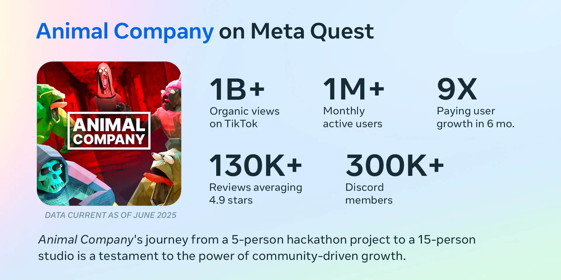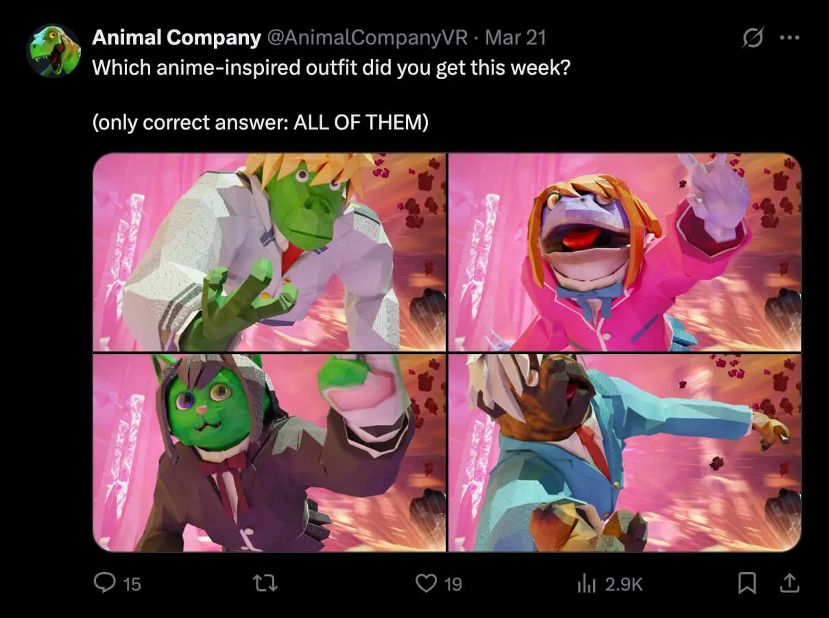 Более миллиарда органических просмотров в TikTok. Более миллиона активных пользователей в месяц. Количество платных пользователей выросло в девять раз за шесть месяцев. Пятое место по доходности на Quest за год. Это результаты не AAA-игры с огромным маркетинговым бюджетом, а бесплатной Animal Company от небольшой студии Wooster Games. И она поделилась своей стратегией партизанского маркетинга: нулевых вложений с впечатляющим результатом.