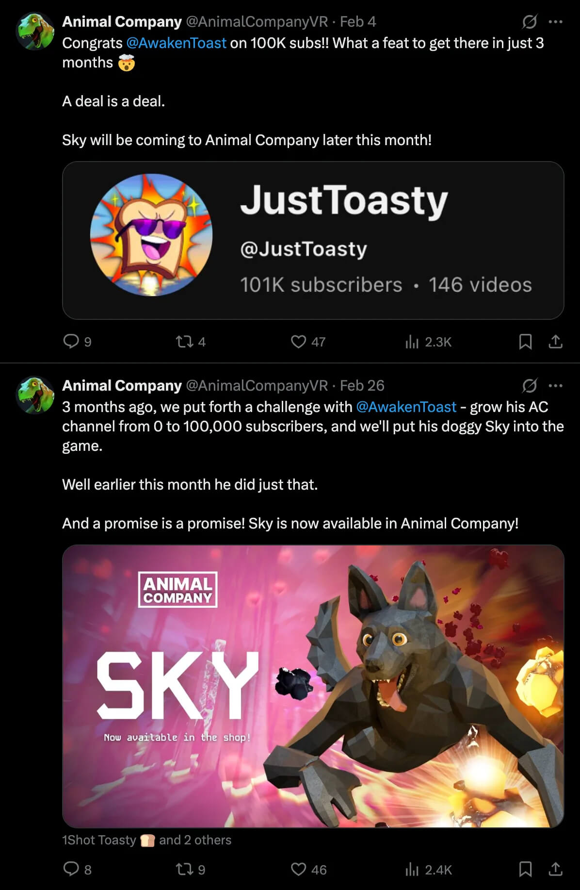 Студия предложила AwakenToast посвятить себя Animal Company и создать отдельный канал. Она пообещала добавить его настоящую немецкую овчарку в игру, если он сможет набрать 100 000 подписчиков. За три месяца канал JustToasty достиг этого показателя. Овчарка Скай навсегда стала игровым аватаром. А Wooster доказала всем, что её продукт может лечь в основу личного бизнеса.