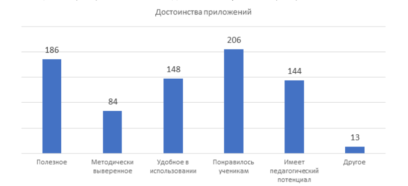 Среди главных достоинств тестируемых приложений участники выделили позитивное отношение школьников (46%), полезность (42%), удобство в использовании (33%), а также педагогический потенциал (32%) и выверенность методики (19%).