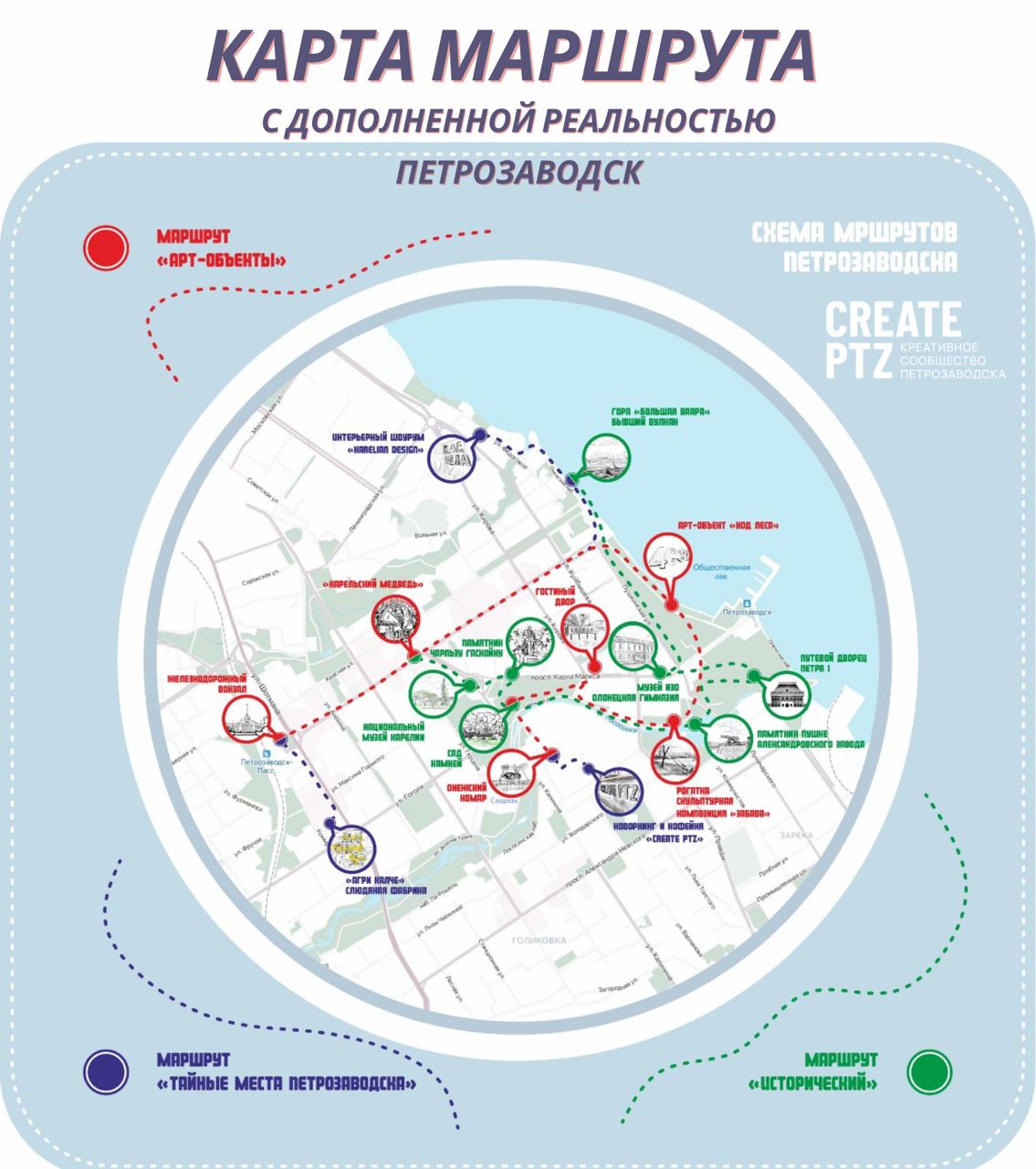 Исторический ведёт по пяти эпохам становления Петрозаводска в формате живых историй. Арт-маршрут открывает городские скульптуры. А цифровая тропа провожает по тайным местам — уникальным галереям, мастерским и арт-площадкам. Концептуально все инсталляции связаны с Карелией. На каждом маршруте также есть специальный контент, такой как пасхалки, мини-игры и бонусы от местного бизнеса, вроде галерей и отелей.