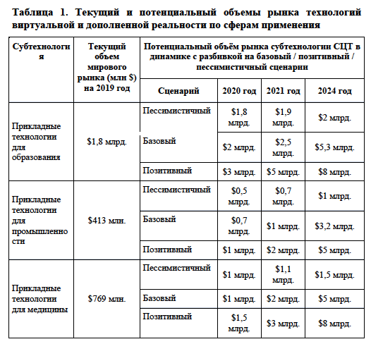 Деятельность Центра НТИ в части реализации проектов должна способствовать развитию профильной СЦТ в России. В перспективе 4-5 лет наша страна имеет потенциал стать видимым игроком на международном рынке VR/AR-решений и занять более 15% мирового рынка VR/AR- технологий. Как минимум, не менее 3 (трех) российских компании к 2024 году смогут занять более 30% одного из приоритетных рынков. Как максимум, российские технологии будут задавать отраслевые стандарты в мире, особенно в направлениях промышленности, медицины и образования.