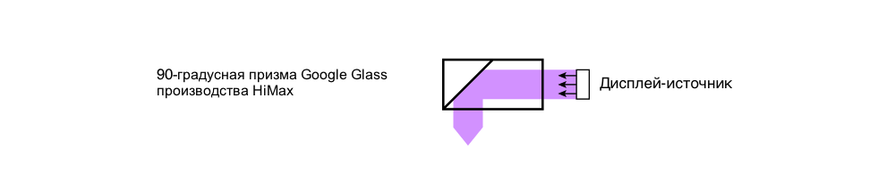 Большинство людей, знакомых со смарт-очками, имеет базовое представление о дисплее Google Glass. Он довольно прост: микродисплей (в данном случае, LCoS) размещается в электронике сбоку и направлен на единственную призму, которая поворачивает свет на 90° в верхний правый угол поля зрения пользователя — в данном случае, в комбинированный оптический блок, в котором размещается и LCoS-дисплей, и призменная оптика от тайваньского OEM-производителя HiMax.