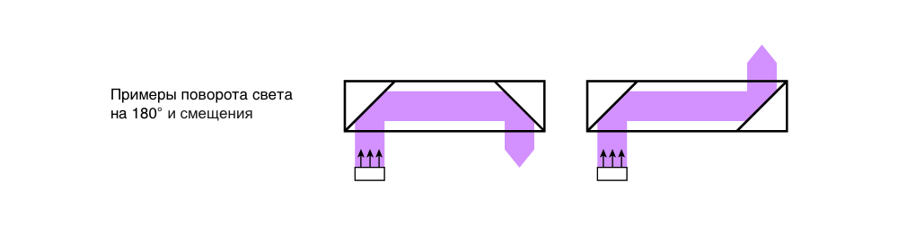 Теперь представьте две такие 90-градусные призмы, расположенные рядом друг с другом. В этой конфигурации можно поворачивать изображение на 180°. В качестве альтернативы, две призмы с углом 90° также могут смещать дисплей в сторону, отправляя свет в прежнем направлении. Показанная здесь в самом простом виде, такая схема является важным принципом волновода.