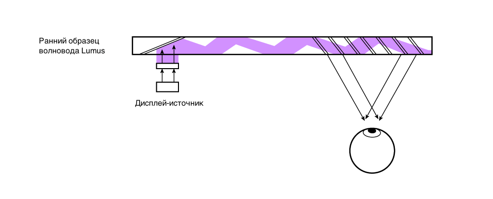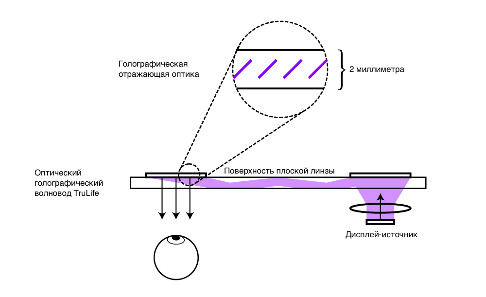 Как и раньше, микродисплей отправляет картинку на другой конец линзы, а голографическая оптика поворачивает свет, проводя однонаправленную световую волну через свою поверхность, а последний набор линз поворачивает поток в глаз пользователя. Этот замечательный технический результат достигается в пределах доли толщины, используемой в волноводах на основе призмы.