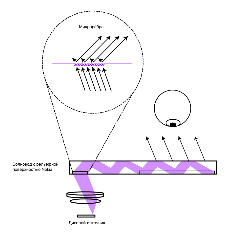 Что касается более сложной конструкции волновода, представьте себе, что призма очень сильно уменьшилась и вытянулась. Теперь эти призматические детали надо разместить на поверхности линзы — это «поверхностный рельеф» волновода. Изображение делится на несколько вертикальных полос и собрано воедино на другом конце линзы перед глазом.