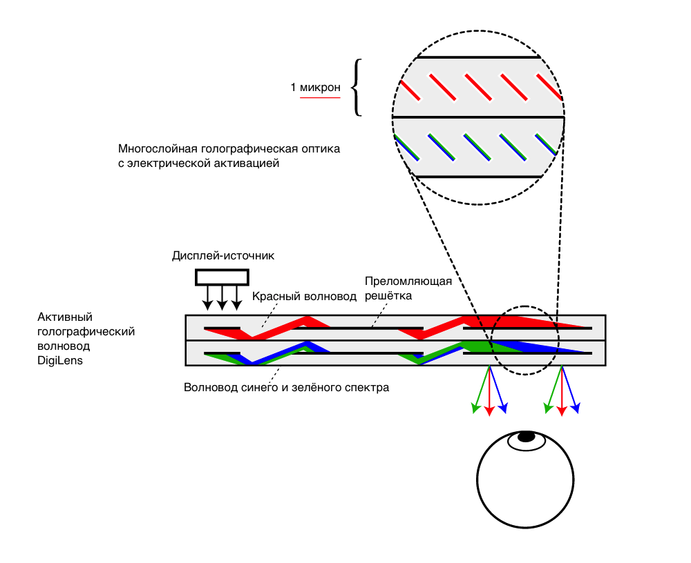 У DigiLens есть «активные» голографические волноводы. Используя тонкоплёночный полимер на основе жидких кристаллов, голографическая зеркальная оптика внутри волноводов DigiLens способна изменять состояние при активации электрическим током.
