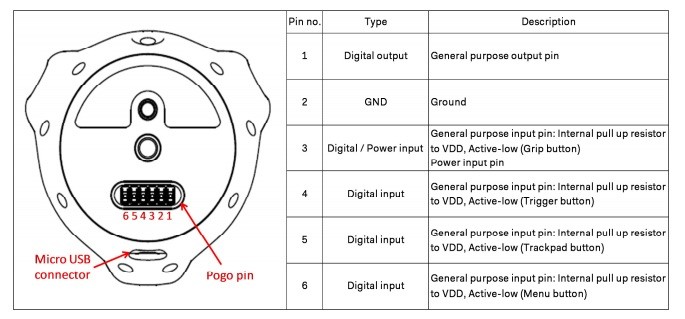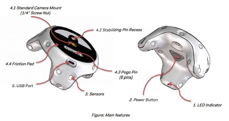 Производитель также подробно остановился на функциональных деталях устройства. Светодиодный индикатор (1) отображает статус Vive Tracker. Кнопка питания (2) отвечает за включение и выключение устройства, а также за его сопряжение по беспроводному каналу. Инфракрасные датчики (3) отражают лазерные лучи с базовых станций и таким образом обнаруживают своё положение в пространстве; чтобы аксессуар не давал паразитные отражения, мешающие работе лазерной системы, его рекомендуется покрывать антиотражающей краской. Крепление (4) полностью аналогично креплению камер для штативов. В его конструкцию входят: винтовое соединение (4.1) типа ¼, ограничитель (4.2) для предотвращения вращения, пружинный контактный порт (4.3) для электрического соединения с аксессуаром, фрикционная прокладка (4.4) для усиления трения между трекером и аксессуаром. Порт microUSB (5) соединяет трекер и аксессуар для обмена данными и энергией.
