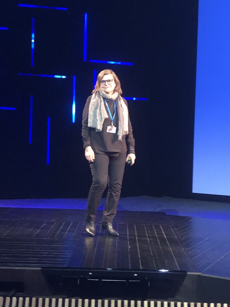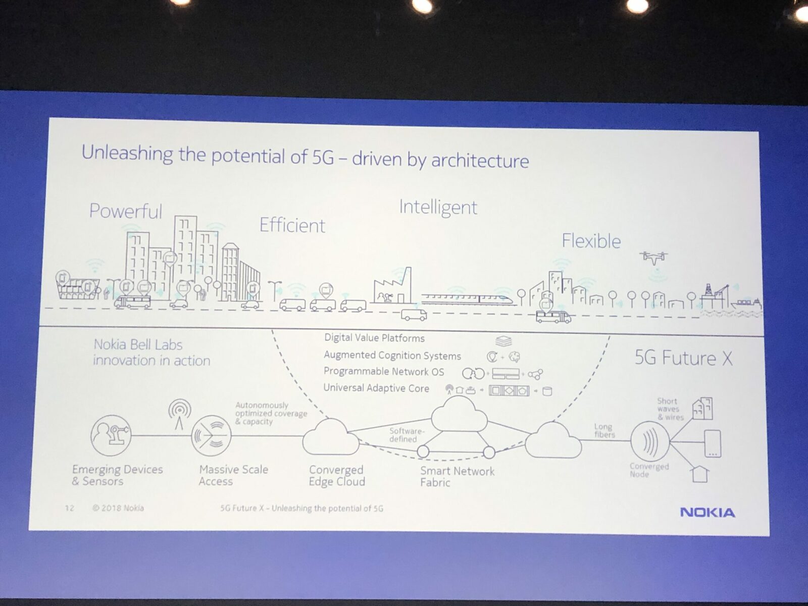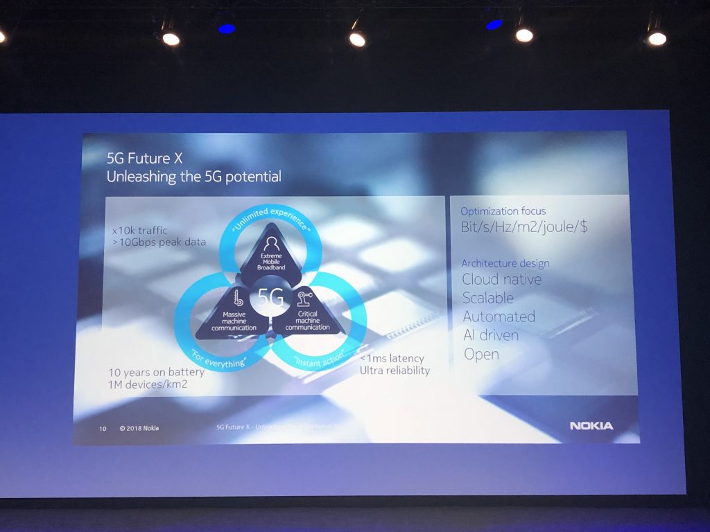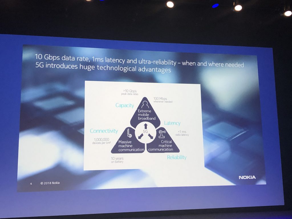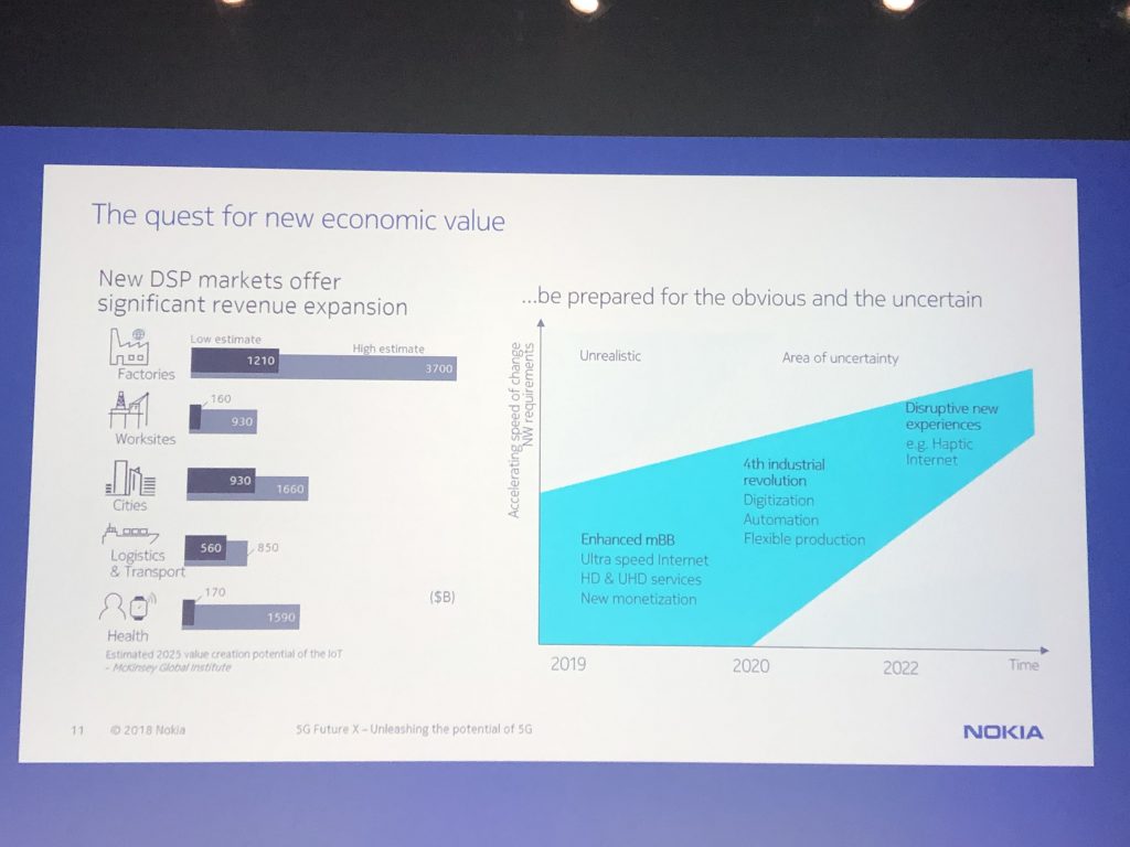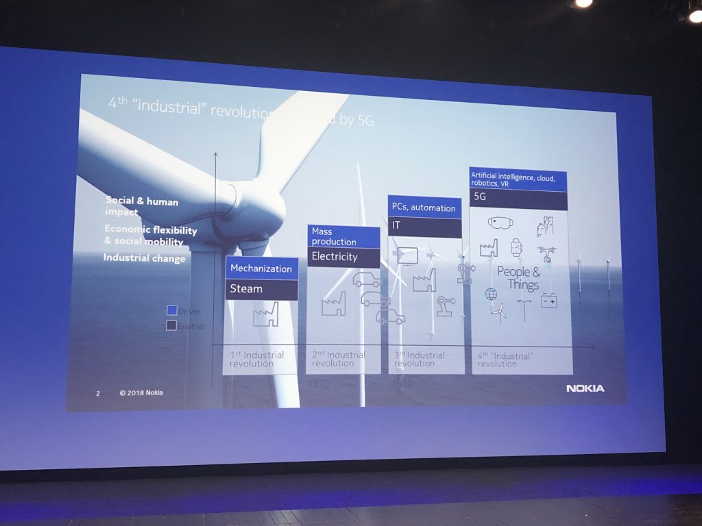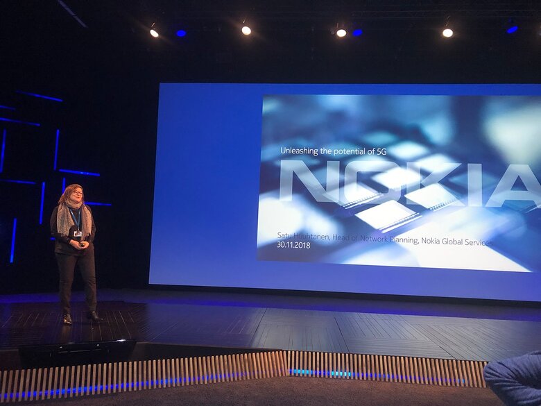 Главную презентацию провела Сату Хуухтанен (Satu Huuhtanen), глава отдела сетевого планирования. Она напрямую связывает 5G и четвёртую промышленную революцию, в которой выделяет направления виртуальной реальности, искусственного интеллекта, облачных вычислений и робототехники. Это путь к «программируемому миру», в котором подключённые к интернету вещи и цифровые данные повсюду.