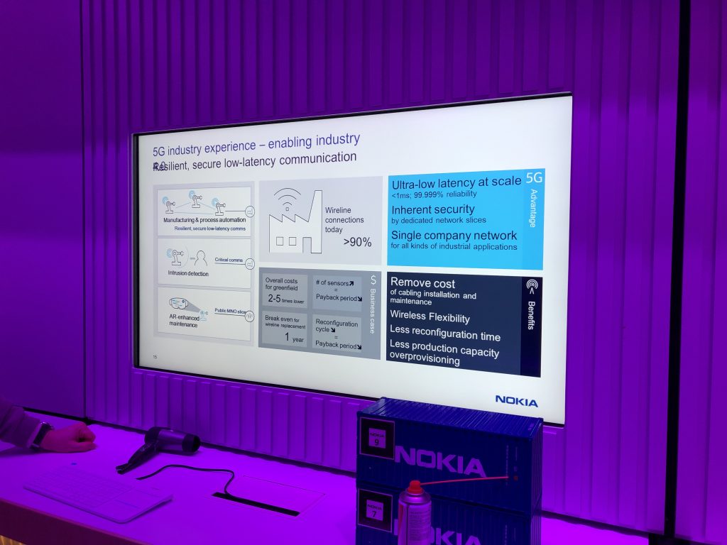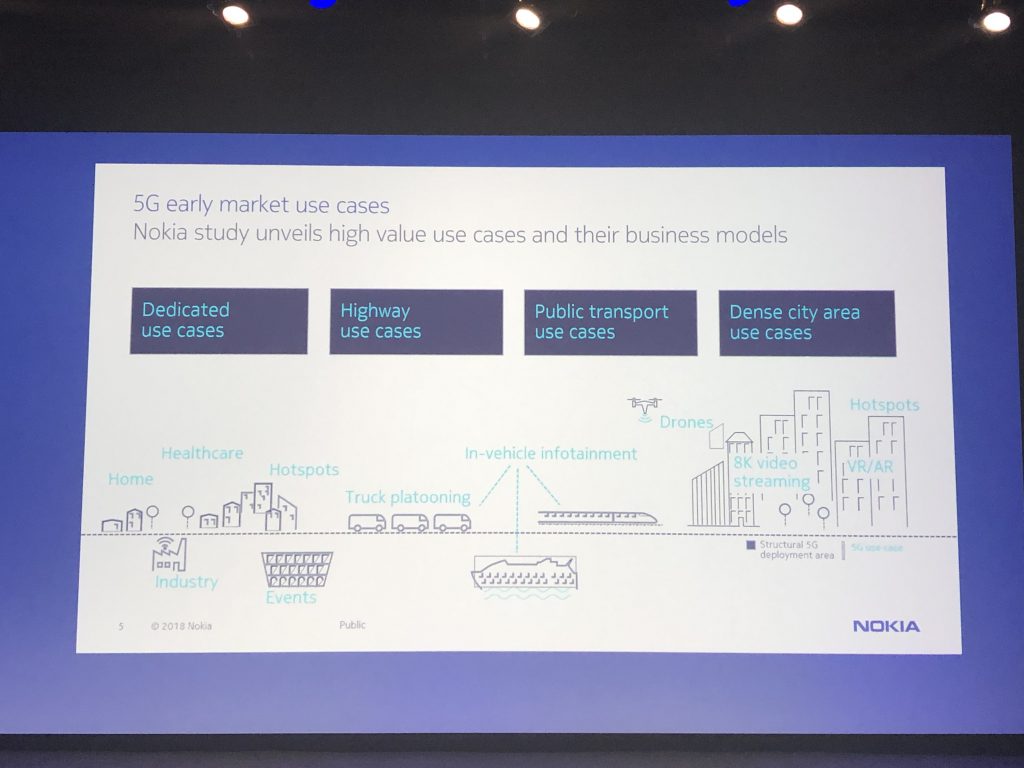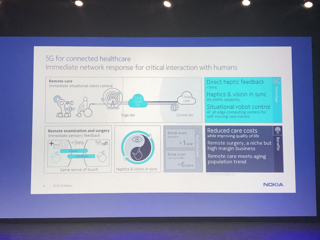 В рассказе о виртуальной реальности представители Nokia подчёркивают отсутствие полевого, коммерческого применения 5G, но говорят, что компания осознаёт перспективы их сочетания, такие как снижение задержек между действиями человека и реакцией оборудования. Это будет полезно, например, для медицинского применения (в хирургии), в промышленности для обучения и телеуправления, а также в игровой индустрии, размеры которой не позволяют её игнорировать даже ориентированной на крупный бизнес финской корпорации.