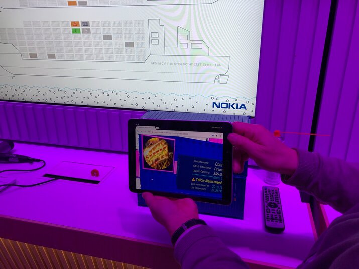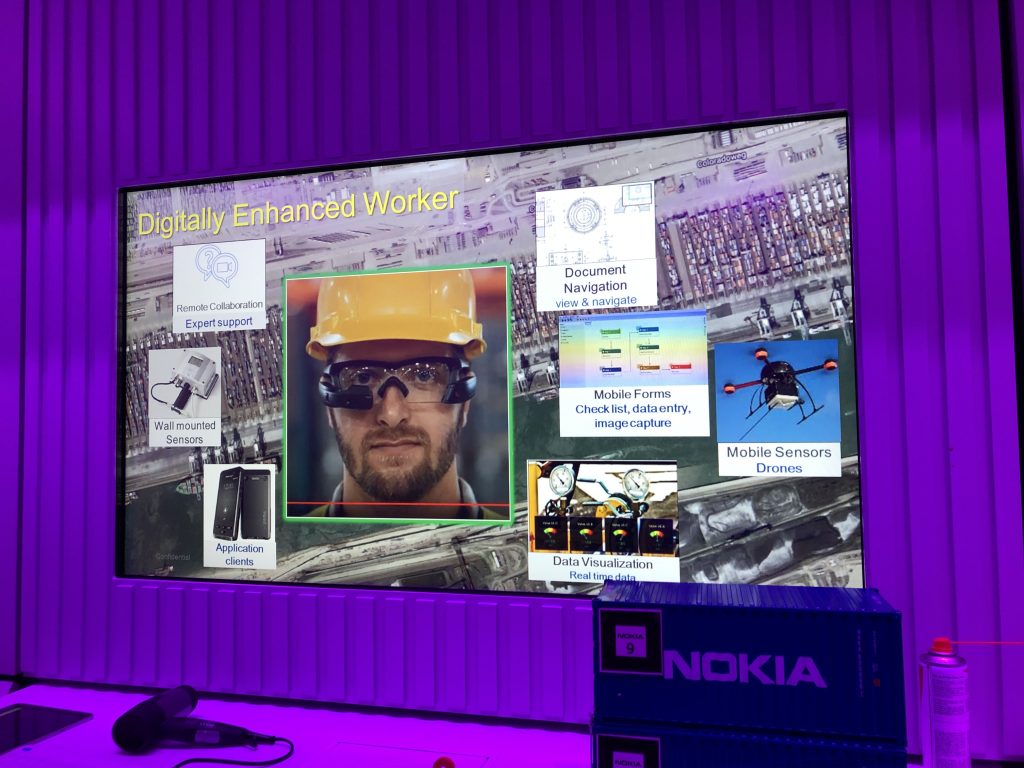 К 2020 году Nokia Bell Labs предсказывает, что количество подключённых к интернету датчиков составит 200 миллиардов. Это наглядно иллюстрирует давно зафиксированный факт: устройств в интернете больше, чем людей. Обслуживание датчиков — огромный бизнес. И тут же сотрудник кампуса демонстрирует кейс дополненной реальности: в морских и океанических контейнерных грузоперевозках важно следить за тысячами контейнеров, а для этого очень хорошо подходят очки, которые видят информацию с датчиков и распознают контейнерную маркировку, делая её «человекочитаемой».