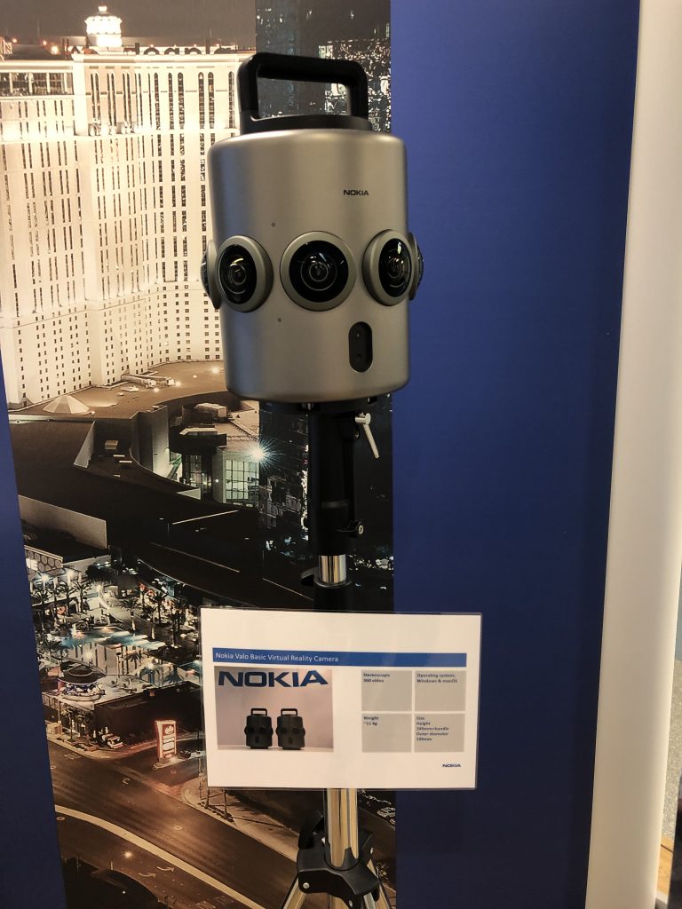 Рядом со стендом Digital Twin расположился стенд Nokia Valo Basic Virtual Reality Camera. Это камера (очевидно, ветвь проекта OZO), которая снимает сферическое стереоскопическое видео, поддерживает Windows и macOS и весит примерно 11 килограммов. Её высота без подставки составляет 249 миллиметров, а диаметр — 190 миллиметров. Более точные характеристики остаются в секрете.