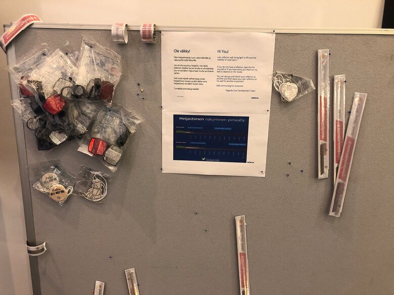 Несмотря на то, что это почти полярный круг, сотрудники Nokia ездят на работу на велосипедах. Темнеет здесь рано, и отражатели действительно полезны при движении по дорогам. Даже если эта доска создана специально для гостей, вы правда можете подойти и взять отражатель, это работает.