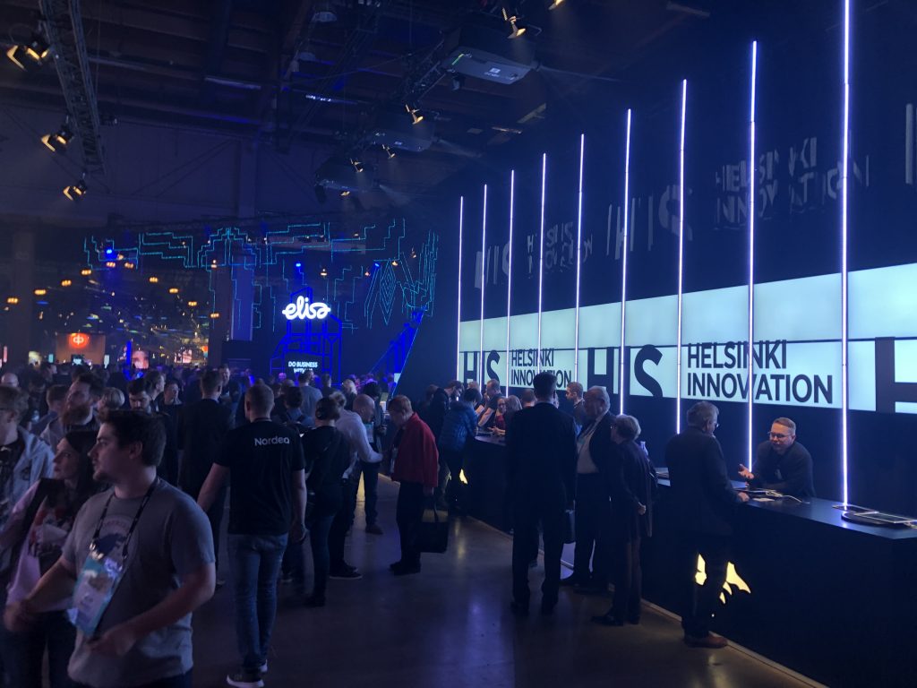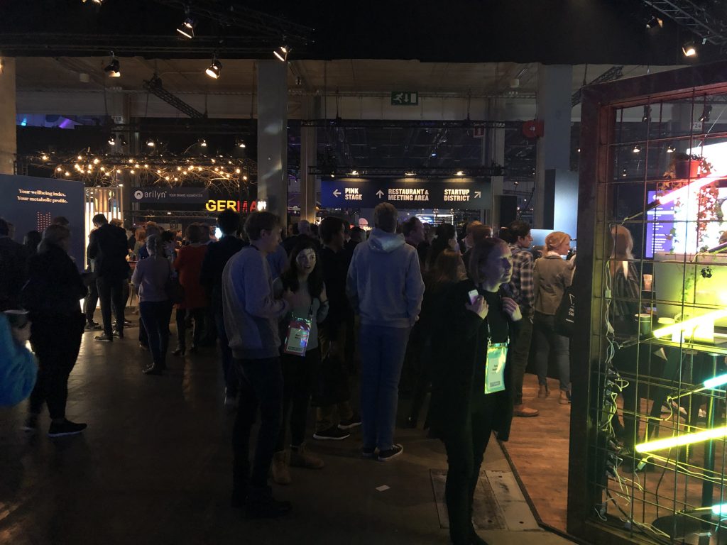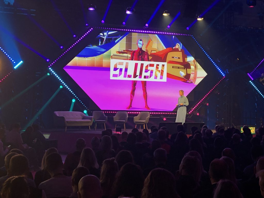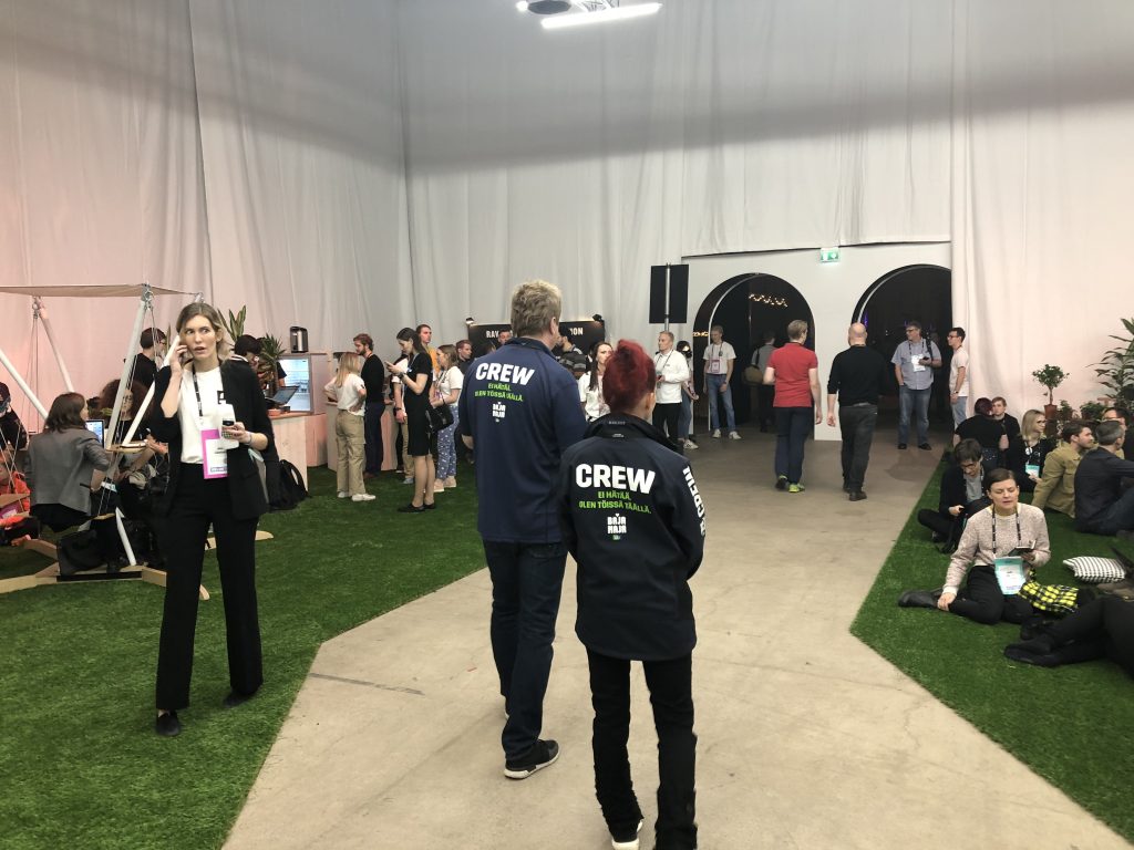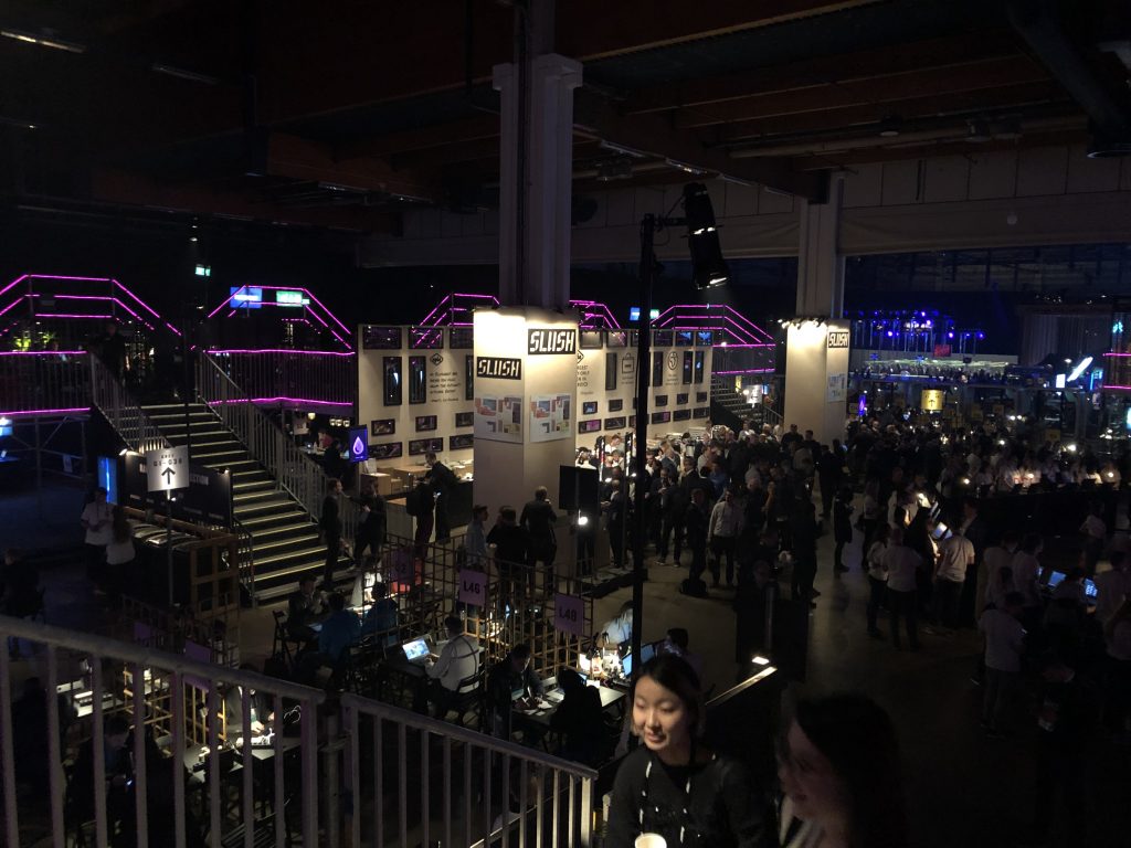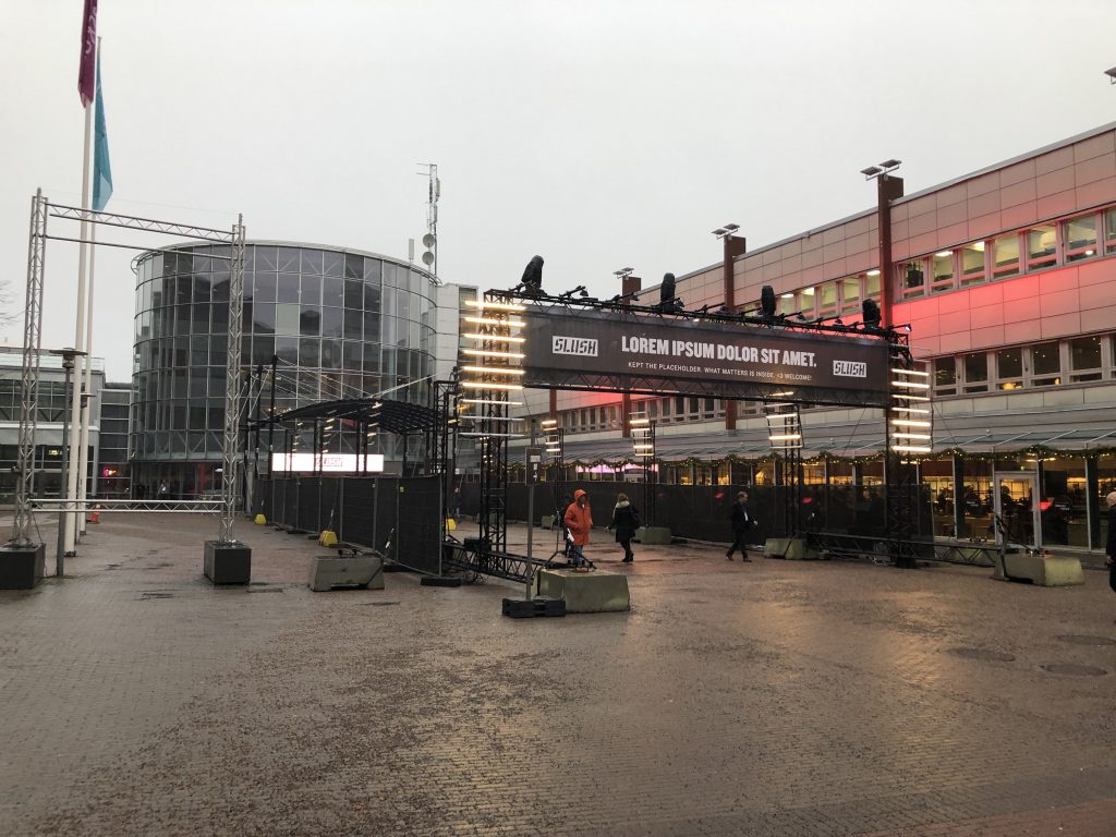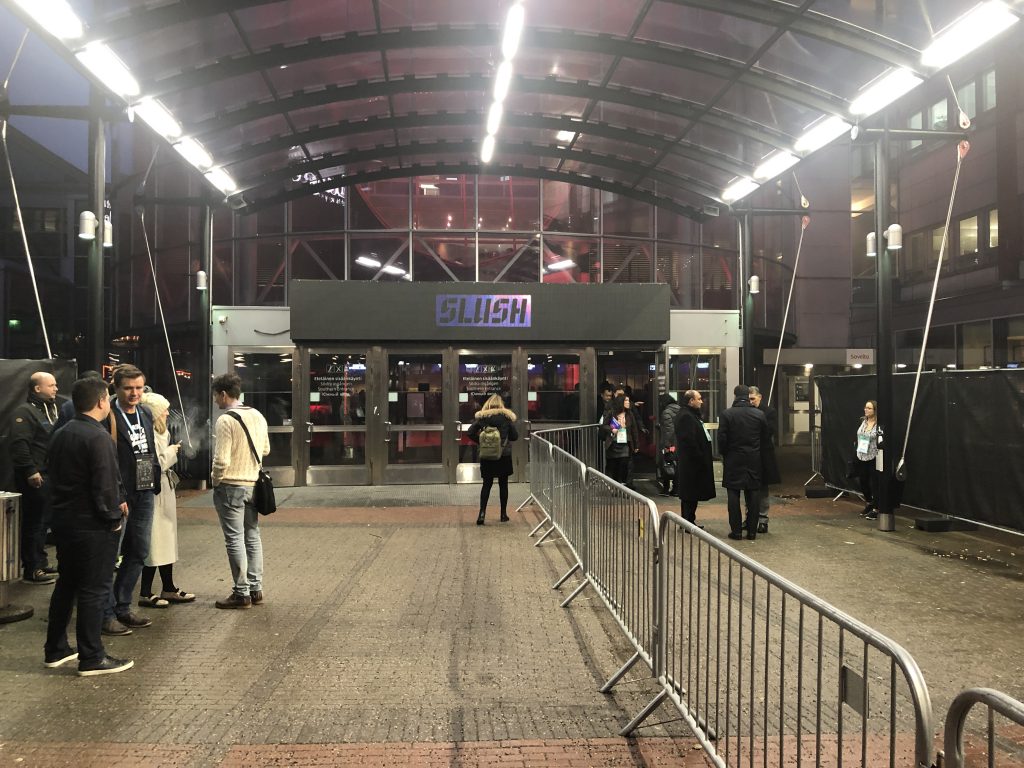 Slush в Финляндии — это огромные пространства, заполненные тысячами людей, причастных к высоким технологиям. Ещё в отеле вы можете заметить, что вокруг появляются люди со  специальными браслетами, разговаривающие о стартапах. После не очень примечательного входа, предъявления пропуска и браслета вашему взору открывается вид на первые коридоры к залам и гардероб на 12 000 мест. На вид он заполнен процентов на семьдесят.