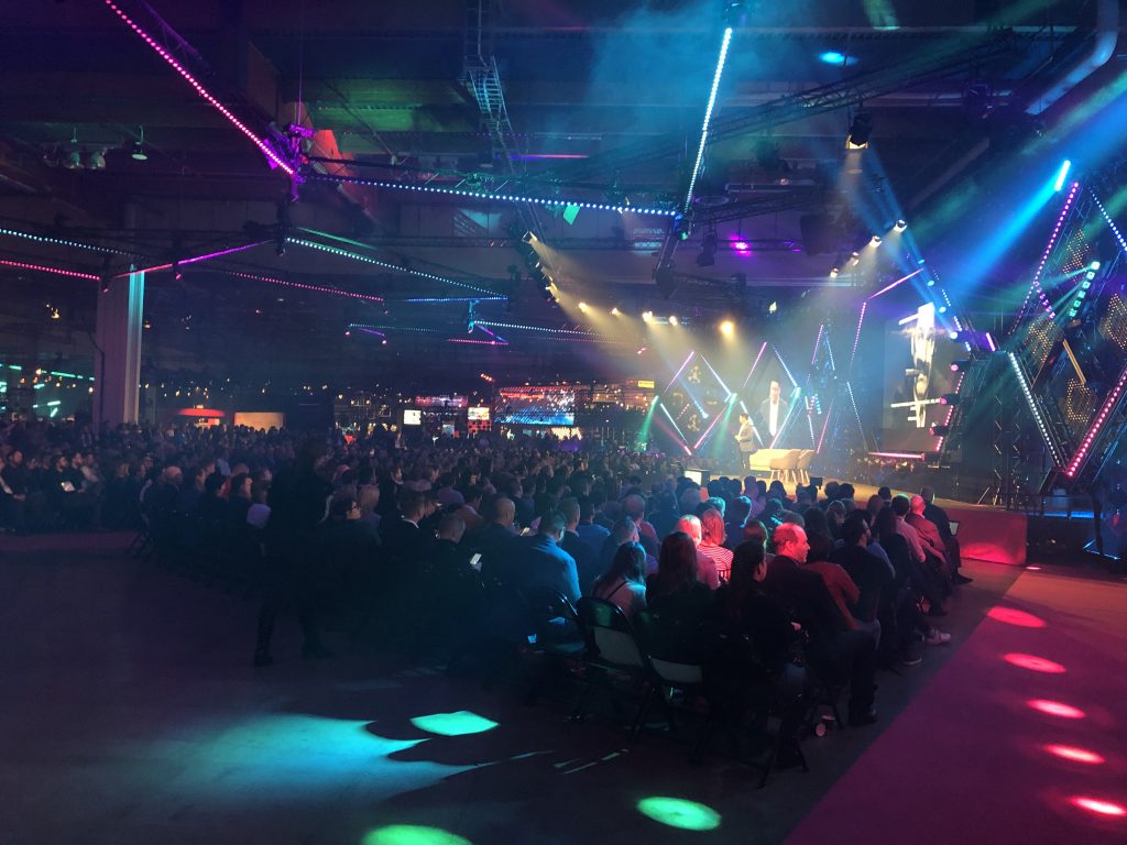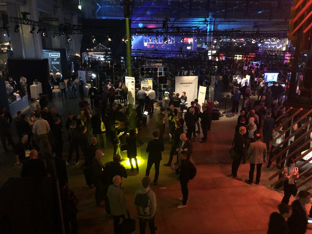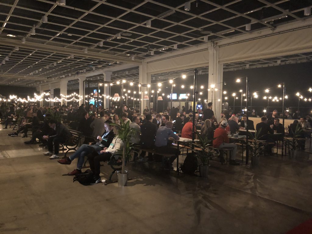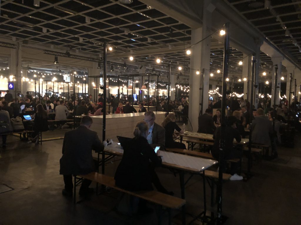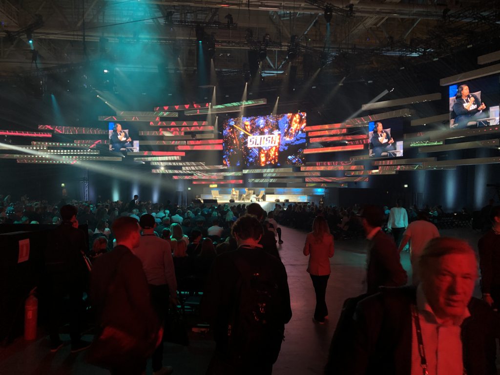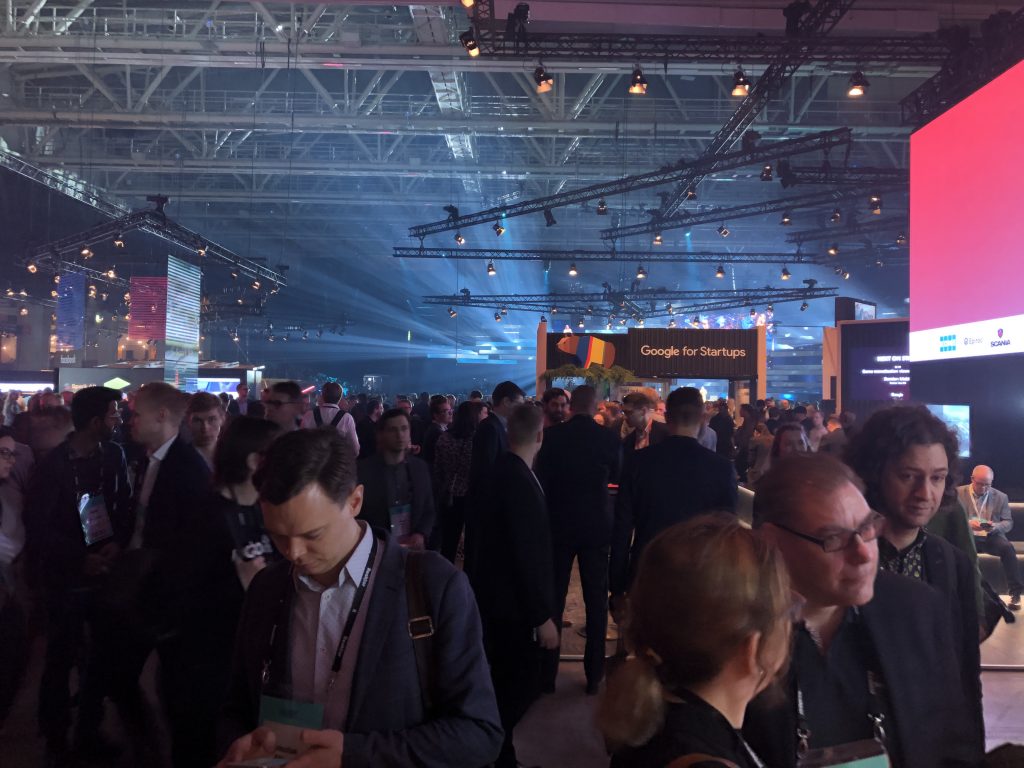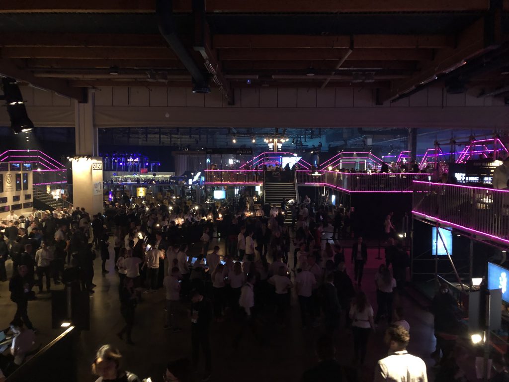 Slush в Финляндии — это огромные пространства, заполненные тысячами людей, причастных к высоким технологиям. Ещё в отеле вы можете заметить, что вокруг появляются люди со  специальными браслетами, разговаривающие о стартапах. После не очень примечательного входа, предъявления пропуска и браслета вашему взору открывается вид на первые коридоры к залам и гардероб на 12 000 мест. На вид он заполнен процентов на семьдесят.