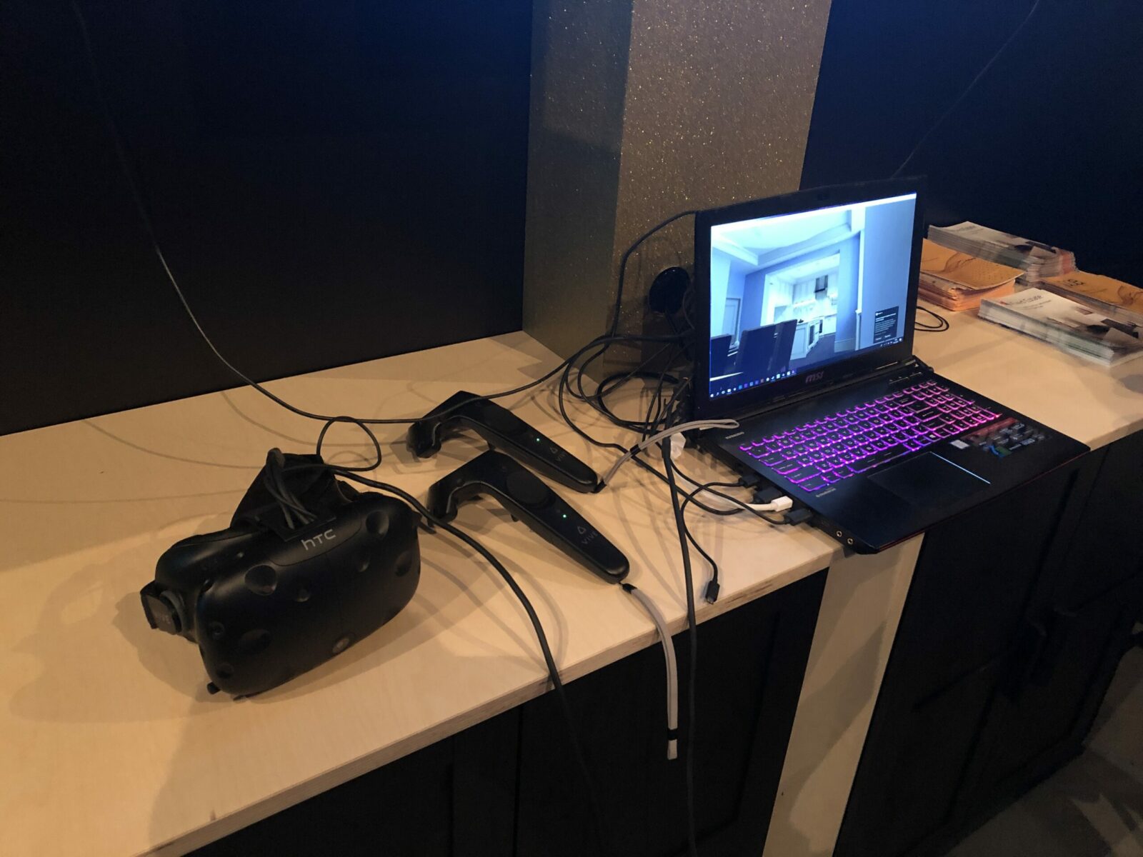 За дверью с очередным замком на карточках нас ждало большое предпроизводственное помещение с несколькими демо-зонами. Первая же порадовала показом очков виртуальной реальности Vive с симулятором рабочей обстановки. На нём стоит остановиться подробнее.