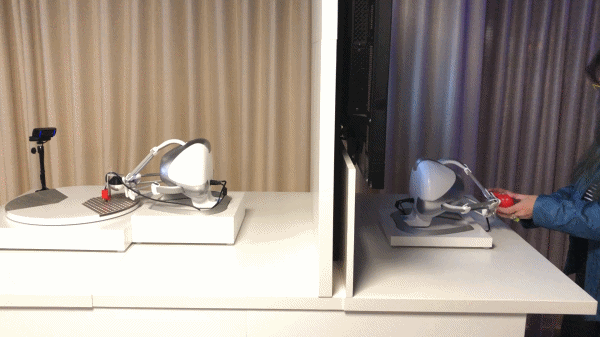 Справа установлен стенд, который показывает передачу физических ощущений на расстоянии без проводов. Пользователь берёт специальный джойстик, который управляет манипулятором, касающимся поверхностей с разным тактильным рисунком. Датчики на манипуляторе воспринимают вибрации и передают их на вибромотор джойстика.