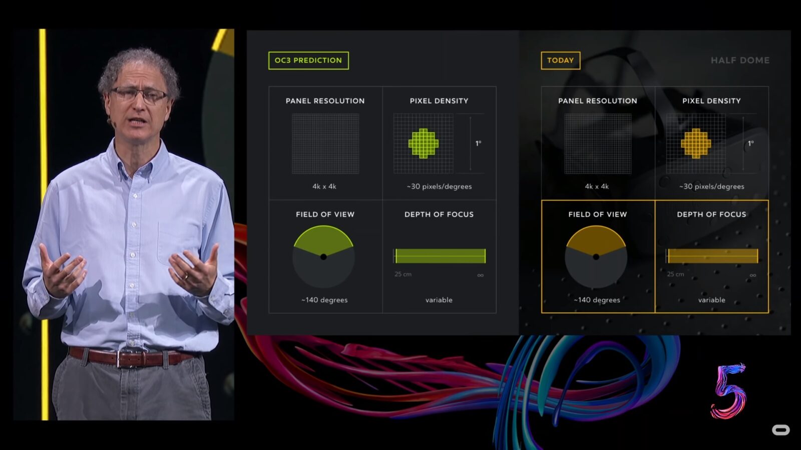 На F8 в начале этого года Facebook представила прототип Half Dome. Несмотря на то, что даже спустя много месяцев это лишь ранний прототип для обкатки технологий, в нём были фактически установлены варифокальные дисплеи со 140-градусным обзором. «Half Dome достиг двух из трёх моих прогнозов на три года раньше», — заметил Абраш, добавив, что реализовать 4K-дисплеи с 30 пикселями на градус будет «просто».