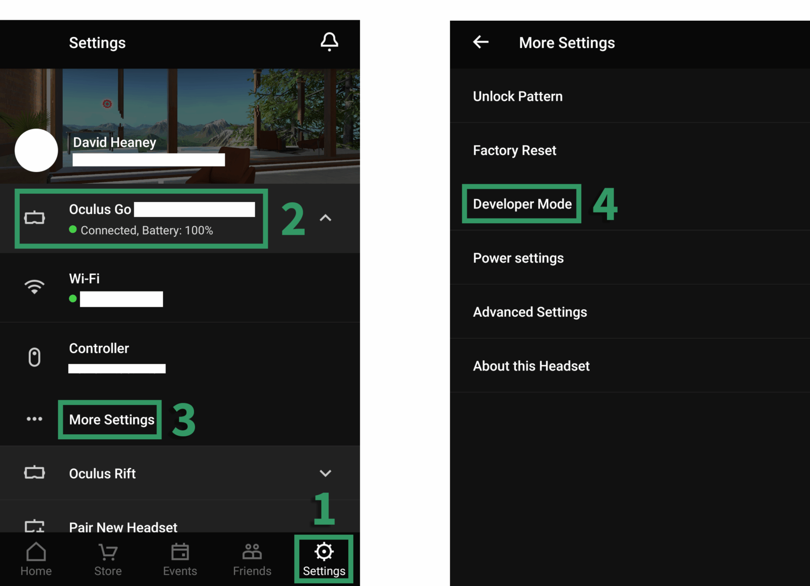 Теперь, когда вы «разработчик», откройте приложение Oculus на своём смартфоне или планшете. На вкладке «Настройки» („Settings“) нажмите на очки Go и нажмите «Дополнительные настройки» („More settings“). В списке вы должны увидеть режим разработчика („Developer Mode“).