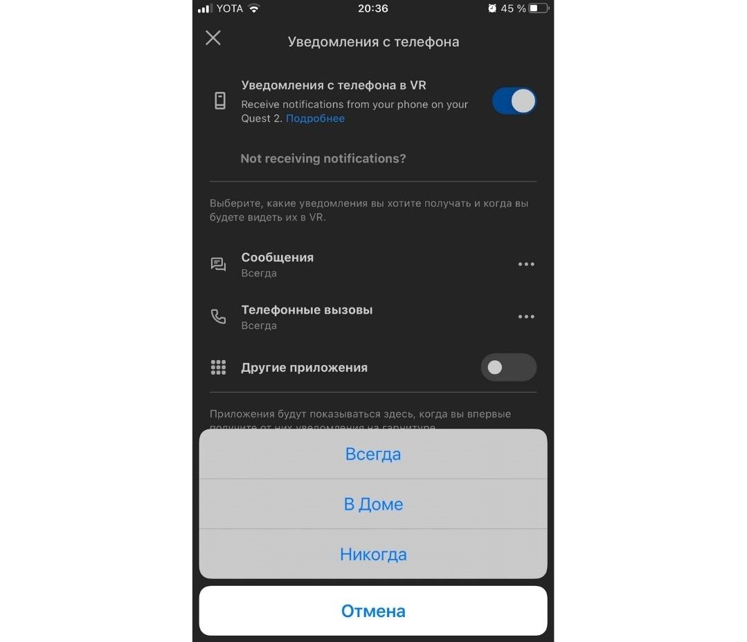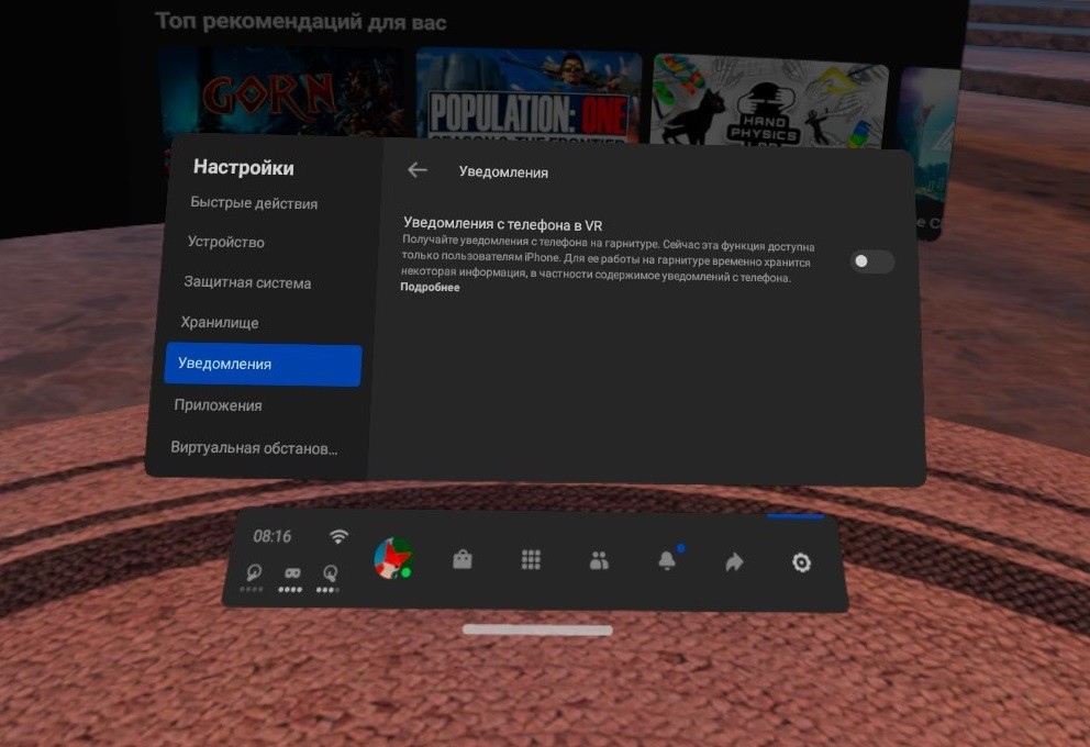 - Включите опцию «Уведомления с телефона в VR».