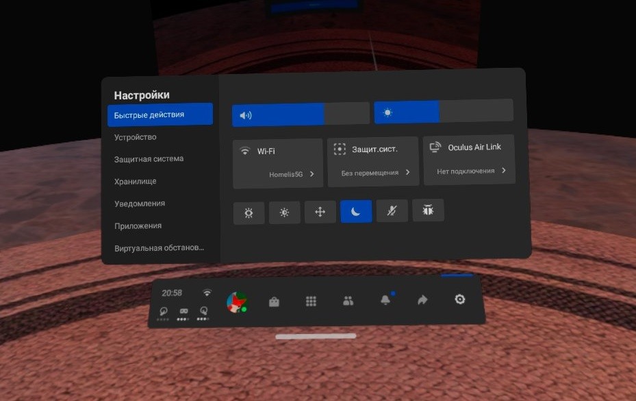 - Наденьте очки и откройте меню Quest, нажав кнопку Oculus на правом геймпаде. Найдите раздел настроек (шестерёнка).
