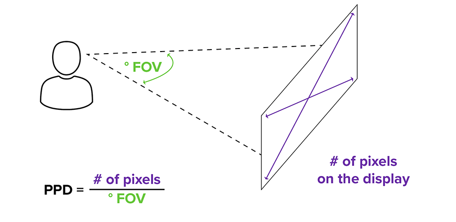 Угловое разрешение или количество пикселей на градус (PPD, pixels per degree) показывает, сколько пикселей будут обслуживать изображение не на дисплее, а за ним — там, где вы его видите. Зная этот параметр, гораздо проще понять, насколько плотной и чёткой будет картинка. Производители по старой памяти пичкают нас разрешением дисплейных панелей, а должны пикселями на градус.