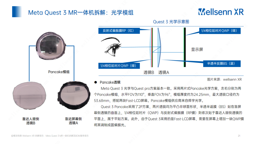 Производитель — Sunny Optical Technology. Это многослойные (блинные) линзы типа 2P плоско-выпуклой асферической формы. Обзорность — 110 градусов по вертикали и 96 градусов по горизонтали, толщина — около 24,25 мм, максимальный диаметр — 53,68 мм. Применяются отражающая плёнка на изогнутой поверхности линзы, плёнка с фазовой задержкой 1/4 между частями линзы и поляризационная плёнка.