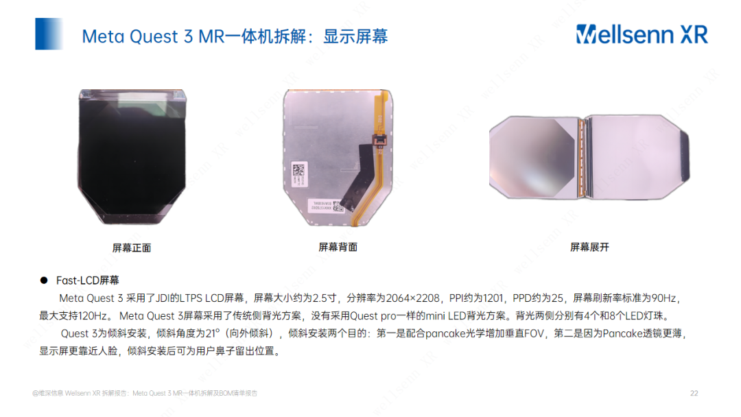 Производитель — JDI. Тип панели — жидкокристаллическая, LTPS. Размер экрана около 2,5 дюймов, разрешение 2064×2208, разрешение около 1201 пикселя на дюйм или около 25 пикселей на градус, стандартная частота обновления экрана 90 Гц, максимальная — 120 Гц. Минисветодиодной подсветки из Quest Pro нет, вместо неё с обеих сторон расположены 4 и 8 светодиодов соответственно. Дисплей устанавливается под наклоном, с углом наклона 21° наружу. Такая установка преследует две цели: увеличить вертикальное поле зрения с блинной оптикой и оставить место для носа пользователя при смещении всего блока ближе к лицу.