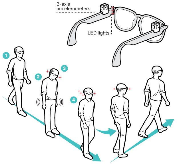 Это заставляет светодиоды на оправе очков попеременно мигать со скоростью, связанной с тем, как субъект шёл ранее. Этот визуальный ключ помогает человеку быстрее выйти из опасного состояния.