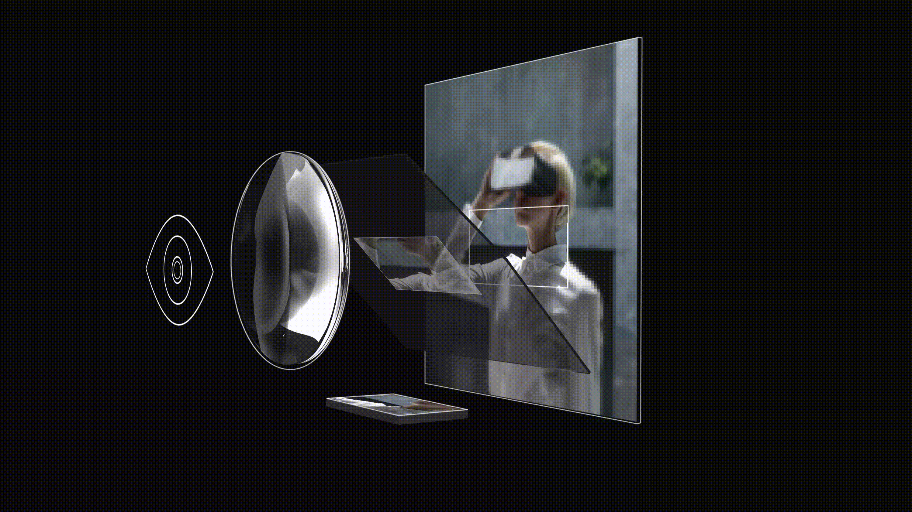 Varjo решила дилемму выбора дисплея. В анимации от финской компании вы можете наблюдать работу её системы. Слева направо: глаз пользователя, обычная линза, подвижная рефракционная оптика (сверху) и микродисплей (снизу), а также обычный дисплей.