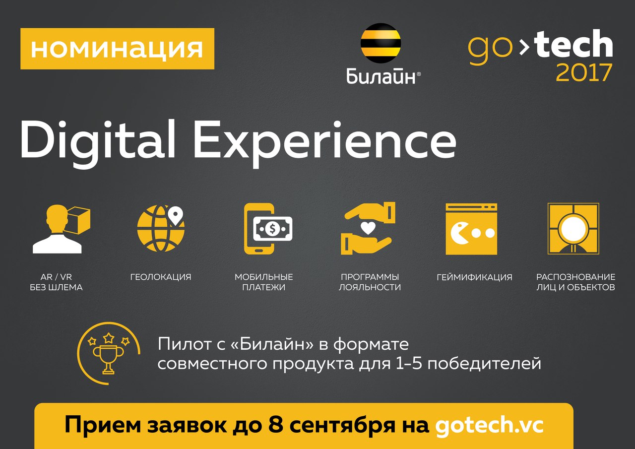 - Прием заявок до 8 сентября 2017 года. При подаче заявки на GoTech в анкете выберите номинацию Digital Experience