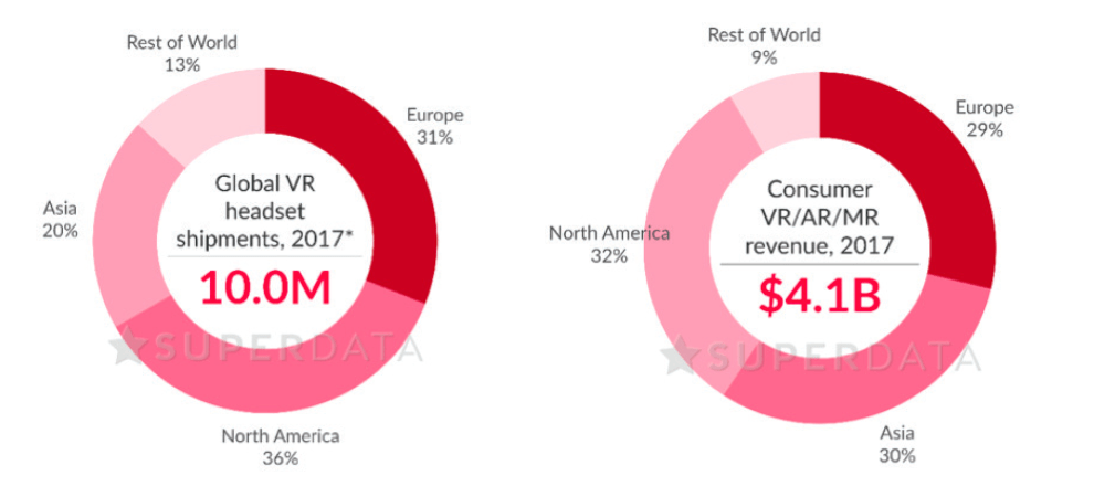 SuperData собрала данные о глобальных поставках очков виртуальной реальности и глобальной выручке от технологий дополненной, виртуальной и смешанной реальности — в 2017 году. Доклад ориентирован на Европу, и данные из него, по совпадению, говорят то, что хочет слышать местный потребитель: рынок Европы догоняет США и опередил Азию.