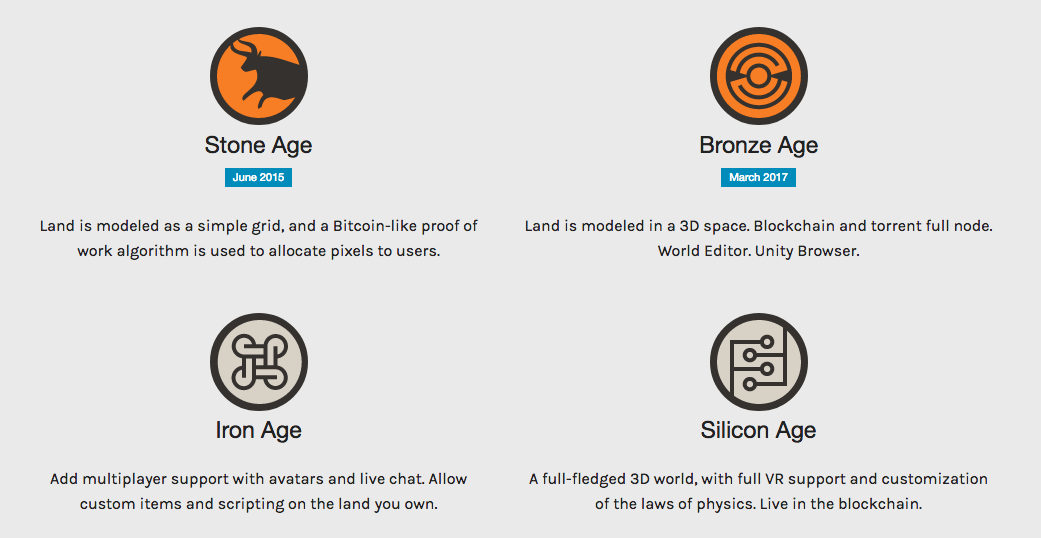 Разработка мира поделена на «эпохи». С июня 2015 года проект переживал Бронзовый век, к которому мир был смоделирован как простая сетчатая карта с биткойн-подобным алгоритмом выделения пикселей пользователям. В марте 2017 года наступил Бронзовый век, и мир был смоделирован в 3D с Unity-браузером, блокчейном, торрентами и редактором. В пока не датированном Железном веке мир получит многопользовательский режим, аватары, чат, а также возможность создания предметов и скриптов. А Кремниевый век принесёт виртуальную реальность с кастомизацией законов, физики и полной поддержкой блокчейна.