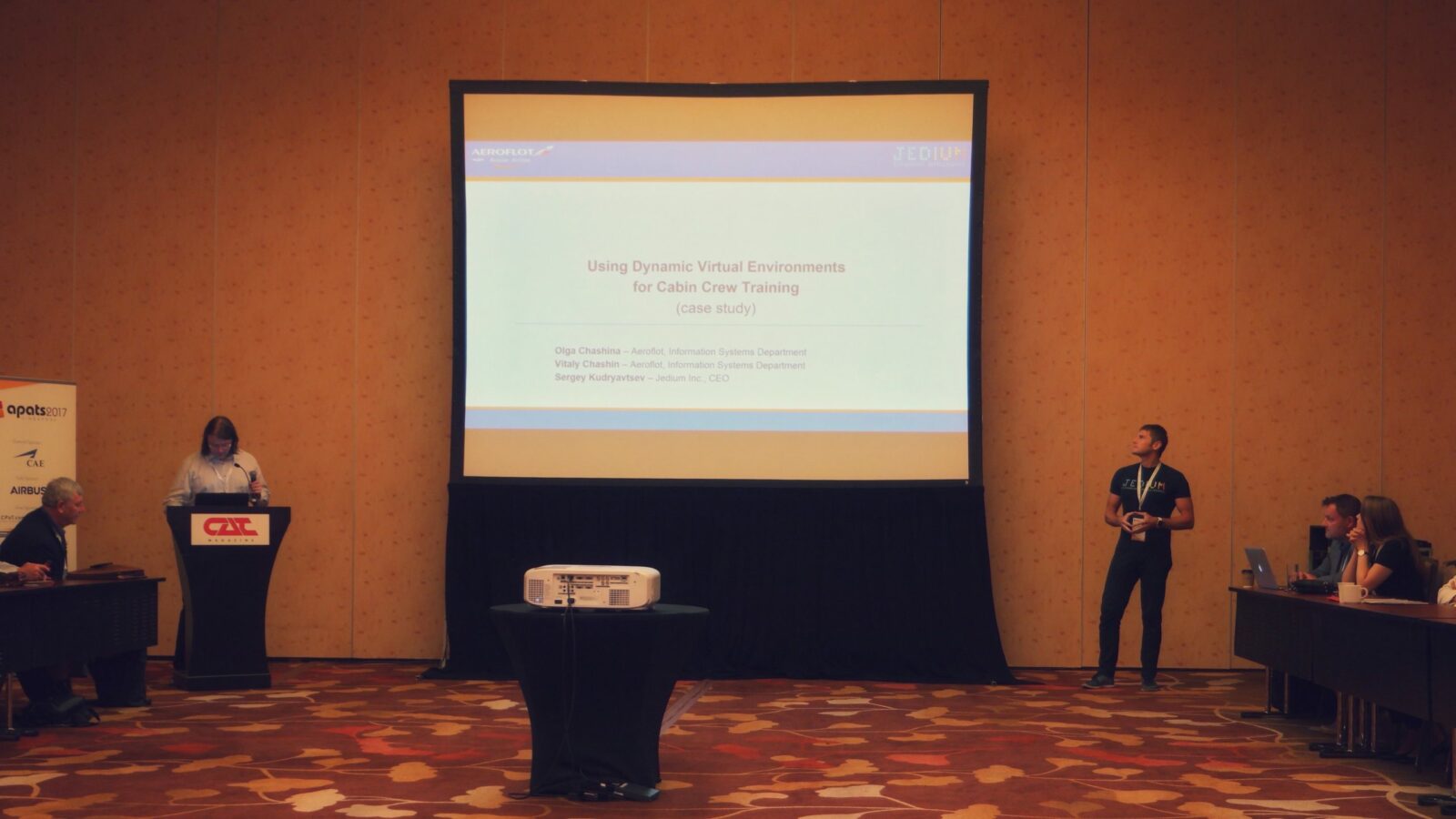 В 2017 году мы создали первую, раннюю версию нашего виртуального пространства. Выбирая область применения, а точнее, область первого контентного примера для неё, мы переиспользовали старый опыт, показав, как можно расширить и улучшить то, что было сделано в Аэрофлоте по обучению бортпроводников. Продукт нужно было показать, и здесь из вариантов оставались только APATS/EATS (хотя AICC по аудитории был бы куда лучшим вариантом). Это мы и сделали, выступив на обеих конференциях. Подготовить материалы для презентации нам помогла Ольга Чащина — инженер-программист, которая совместно с Виталием участвовала в разработке первых версий платформы.