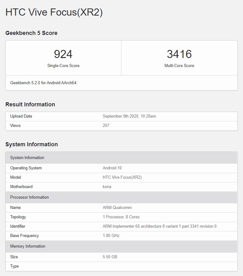 Запись на сайте теста производительности Geekbench говорит о том, что HTC готовит к релизу новую версию автономных очков Vive Focus, ядром которых станет процессор Snapdragon XR2, самый свежий чип Qualcomm, разработанный специально для очков дополненной и виртуальной реальности. Программной основой протестированного устройства служила Android 10.