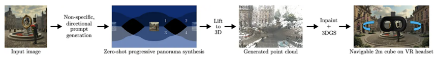 Процесс включает два этапа: создание согласованных панорам с использованием предварительно обученной диффузионной модели и перевод их в 3D с помощью метрической оценки глубины. Затем идёт заполнение ненаблюдаемых областей закрашиванием облаков точек, что якобы требует минимальной настройки.