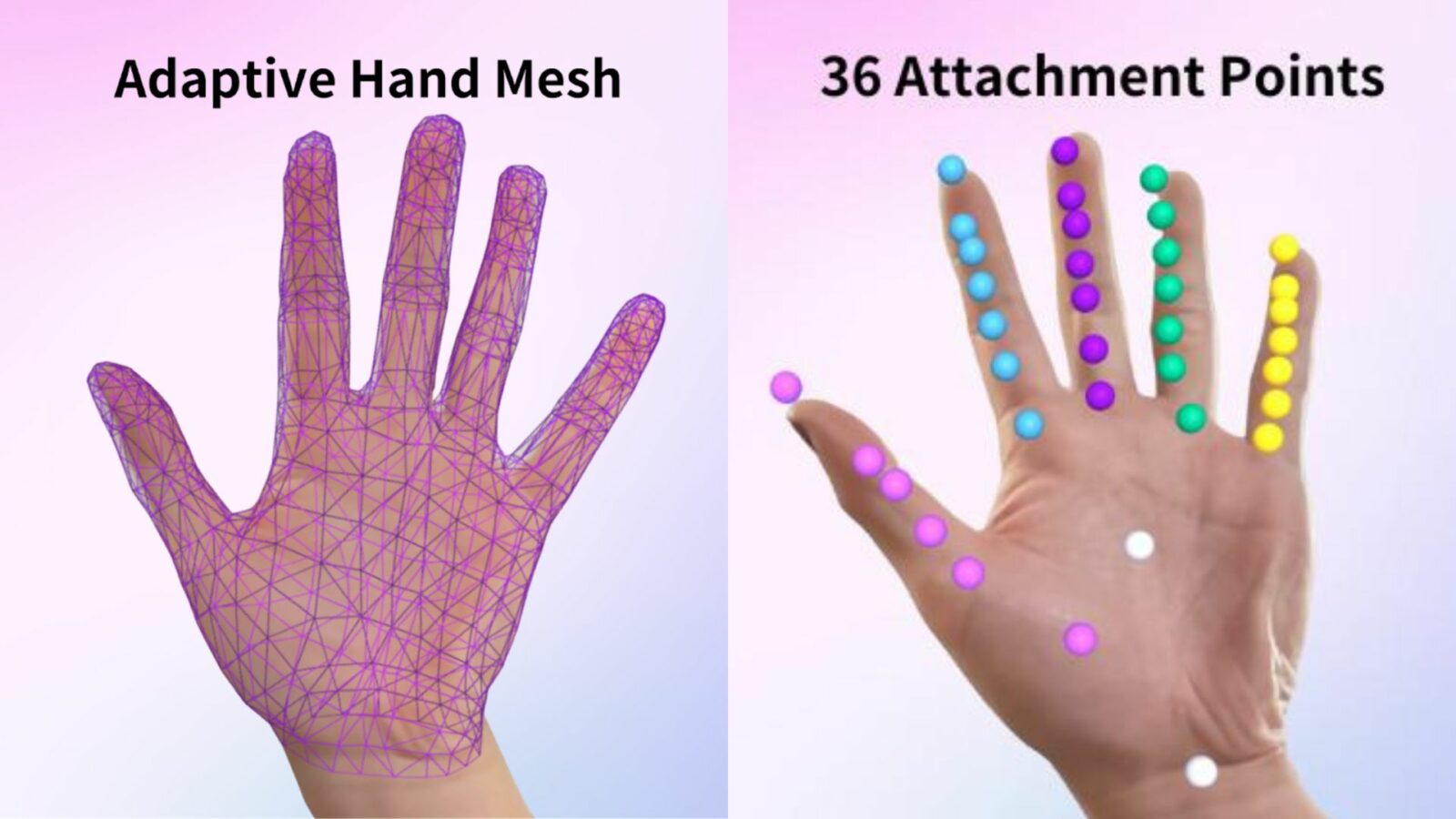 Модель включает 36 точек крепления, распределённых по пальцам, суставам, запястью и ладони. Каждый палец содержит до семи точек, что позволяет контролировать положение и вращение закрепляемых объектов. Niantic, управляющая 8th Wall как собственным веб-подразделением, говорит, что наличие этих точек поможет сэкономить время на разработку, быстро привязывая объекты и события к рукам.