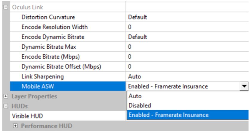 Затем нужно запустить средство отладки Oculus и установить для параметра «Mobile ASW» значение «Enabled — Framerate Insurance». Значение «Disabled» принудительно выключает AFI, а «Auto» использует настройки по умолчанию, но в 38 версии софта значение по умолчанию — «Отключено». Выбор «Включено» или «Отключено» вместо «Авто» переопределит настройку для будущих релизов.