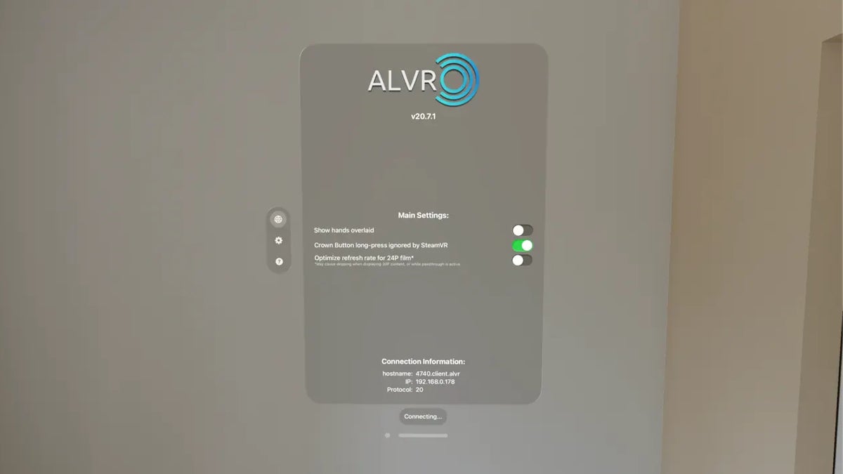 ALVR — это альтернатива Virtual Desktop, Steam Link, Quest Link и Air Link, но с открытым исходным кодом и старше всех перечисленных конкурентов. Вскоре после релиза Vision Pro разработчик Чжуовей Чжан портировал ALVR на новинку, а его коллега Макс Томас доработал и выложил приложение в TestFlight, который в экосистеме Apple можно считать эквивалентом App Lab для Quest. Затем пришло обновление.