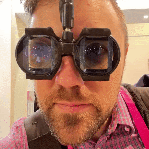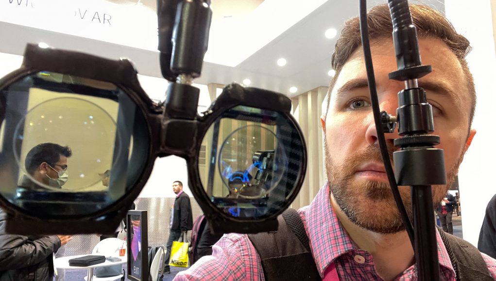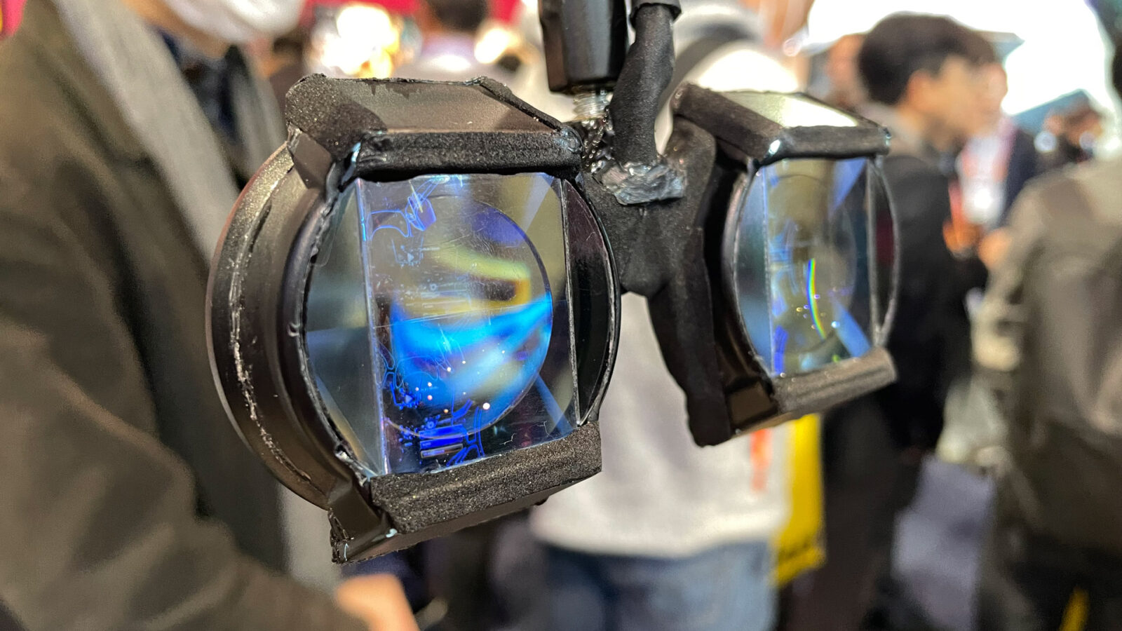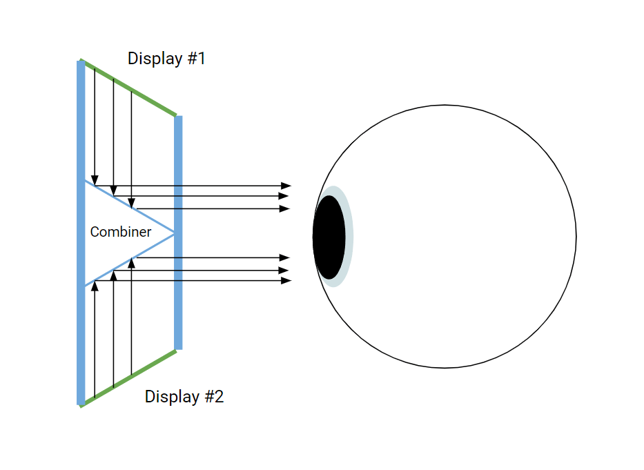 Один дисплей (или одна половина) находится над глазом, а второй — под ним. Изображения с них сливаются в одно. Эта схема позволила значительно сократить размеры оптики без критичной потери поля зрения. Обратной стороной разработки может стать сложность и дороговизна производства. Судить об этом лучше по ценам, которые разработчик публично не назвал.