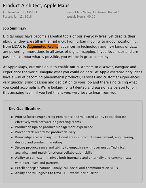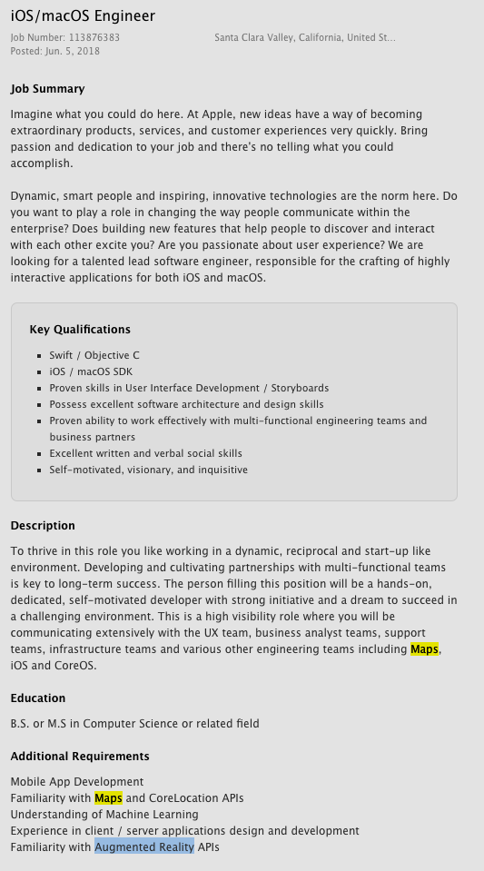 Ещё одна показательная вакансия купертинцев опубликована в июне. На позицию инженера по iOS/macOS нужен был человек, «знакомый с картами» и «с API дополненной реальности». Их упоминание косвенно связывает эту вакансию с августовскими.