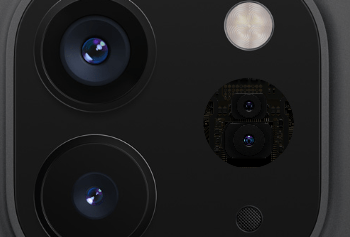 Система камер похожа на модуль от iPhone Pro, но отличается по составу. В ней широкоугольная камера на 12 мегапикселей и сверхширокоугольная на 10 мегапикселей с двукратным оптическим зумом. Записывать звук помогают пять микрофонов.
