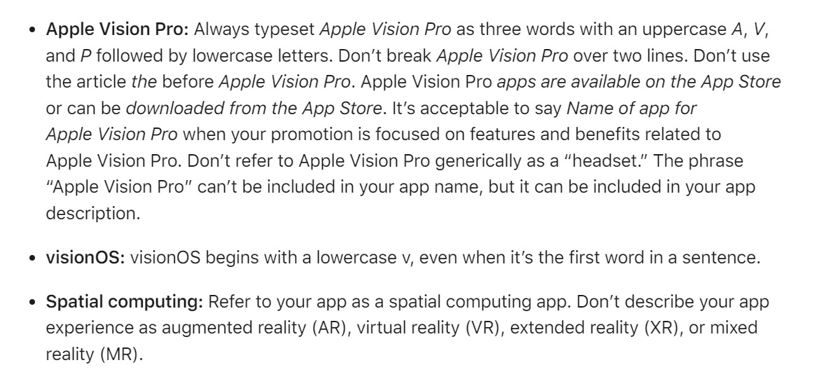 Что касается текстов, Apple просит писать visionOS с маленькой буквы v и Apple Vision Pro вместо Vision Pro и других вариаций. В опалу попали термины «виртуальная реальность», «дополненная реальность», «смешанная реальность» во всех вариациях и аббревиатурах, а также XR, чтобы бы вы под этим ни подразумевали. Вместо этого Apple рекомендует говорить, что приложения для visionOS — это «приложения пространственных вычислений» (spatial computing apps).