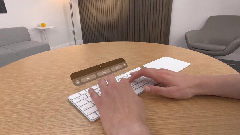 Ориентирование очков в пространстве открывает естественное взаимодействие с контентом глазами и руками вместо сенсорных экранов, мышей и физических клавиатур. Здесь нет даже контроллеров, как в Quest, поскольку Apple считает, что добилась достаточных успехов в трекинге, чтобы убрать их из комплекта. Однако это порождает вопросы к работе с текстами, значимой части взаимодействия людей с компьютерами.