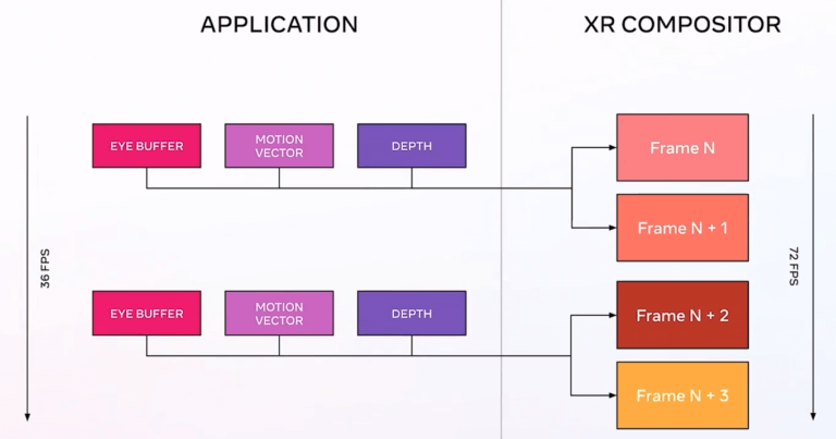 Application SpaceWarp включается или выключается разработчиками приложений. Она использует буфер глубины (Z-буфер) и векторы движения от игрового движка для экстраполяции вероятного следующего кадра за каждым полученным «естественным» путём.