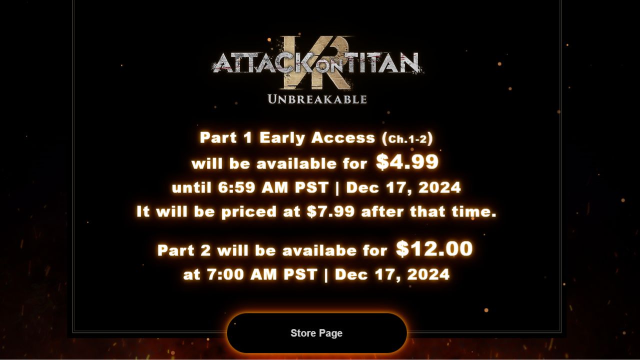17 декабря Attack on Titan VR: Unbreakable, игра по мотивам сериала «Атака Титанов», выйдет из раннего доступа, получив режим ​​совместного прохождения и дополнительные миссии. После публикации первых двух глав в июле это одновременно доведёт версию до первой стабильной (1.0) и завершит сюжетную линию.