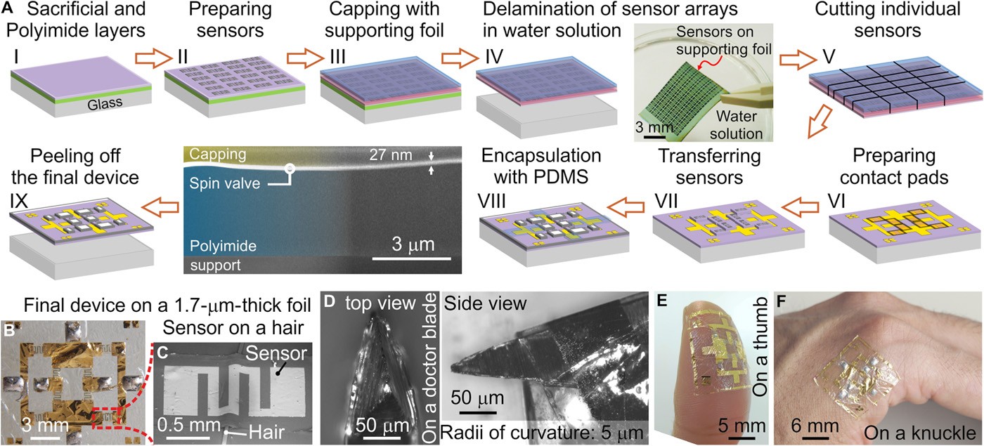 Электронная оболочка представляет собой плёнку толщиной 3,5 микрометра в месте расположения датчиков. Они печатаются на одном из слоёв плёнки: в эксперименте использовалась полиимидная фольга толщиной 1,7 микрометра, на которую нанесены восемь двухмерных датчиков на спиновых клапанах в электрической схеме «мост Уитстона». Датчики механически незаметны, но позволяют человеку с нанесённой на тело «кожей» с удобством взаимодействовать с магнитными полями, передавать в компьютер положение тела, и манипулировать объектами без физического контакта.