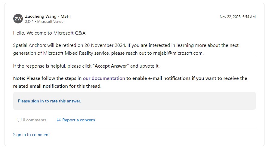 В ответ на вопрос о том, какую замену Microsoft рекомендует для сохранения функциональности приложений, в компании предлагают «узнать больше о следующем поколении сервиса Microsoft Mixed Reality», отправив письмо по адресу rnejabi@microsoft.com.