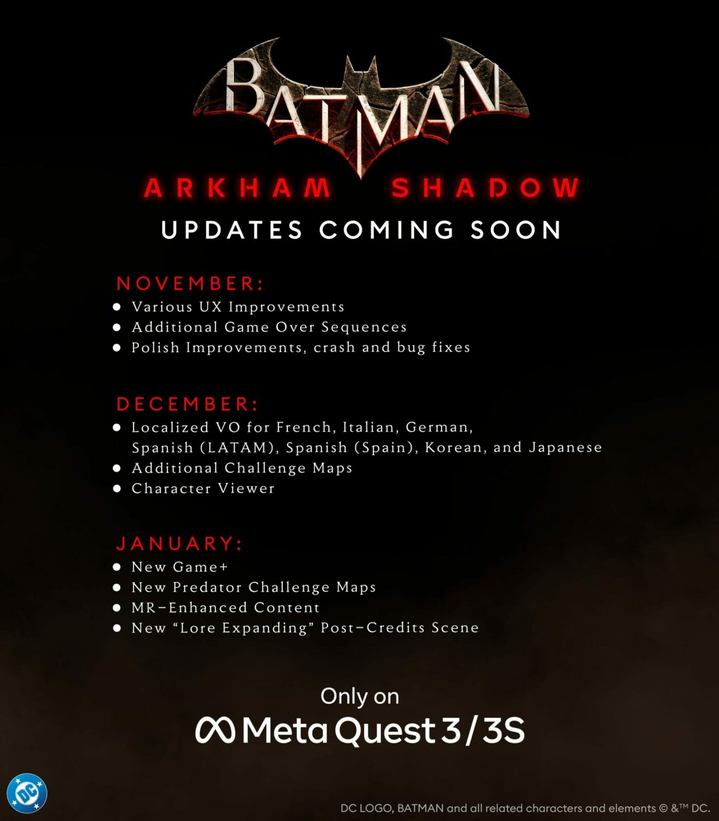 Посвежевшая Batman: Arkham Shadow предлагает режим New Game+ с переносом в него всего прогресса и новый ролик после титров специально для этого режима. Релиз является последним крупным обновлением из тех, которые анонсировали разработчики.