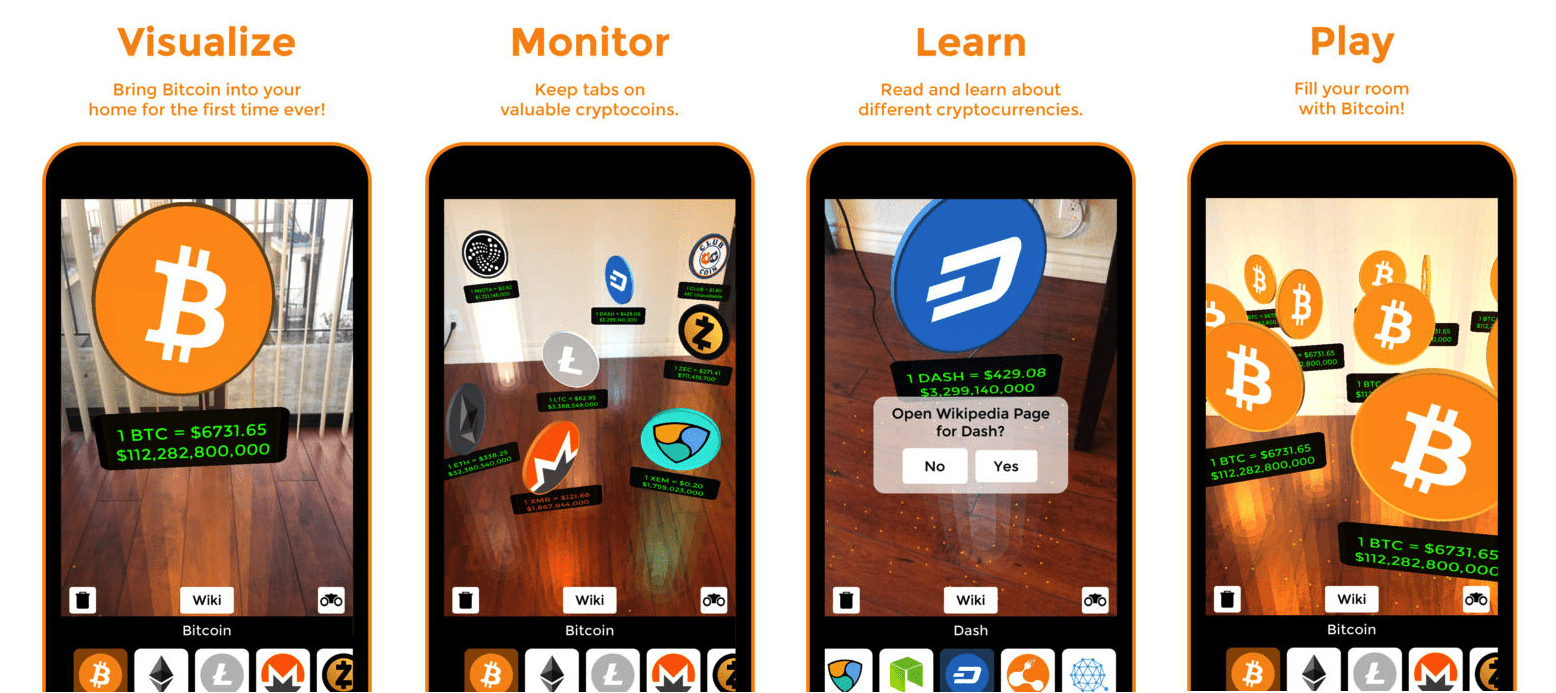 Разработанное жителем Лос-Анджелеса Брайаном Эдельманом (Bryan Edelman) приложение Bitcoin AR может стать предметом изучения как хрестоматийный пример околотехнологического хайпа. С помощью дополненной реальности оно красочно показывает биржевую динамику самых известных криптовалют, включая Bitcoin, Ethereum, Monero, ZCash, Ripple, IOTA, NEM, Dash, Lisk, Neo и Litecoin, а также предоставляет полезную информацию о «монетах» из Википедии.