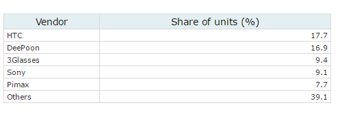 Большую долю (39,1%) в отчёте Canalys занимают «другие поставщики». Это говорит о высокой насыщенности и сегментированности китайского рынка ВР-устройств. Такое положение дел обусловлено развитым производством электронных компонентов, доступность которых снижает порог входа на рынок новых игроков и увеличивает возможности небольших фирм в борьбе с западными конкурентами. Стоит также отметить, что компании DeePoon и 3Glasses расширяют зону своего влияния за пределы потребительского рынка — на рынок устройств для бизнеса.